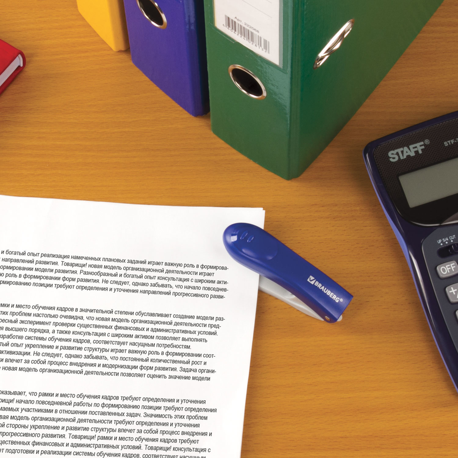Настольный степлер BRAUBERG t;Originalt; с антистеплером в синем пластиковом корпусе с металлическим механизмом cпособен скрепить до 12 листов. Подходящий размер скоб № 10. Виды сшивания: закрытый, прямой. Глубина закладки бумаги - 47 мм. Габариты: высота - 40 мм, ширина - 20 мм, длина - 90 мм. Благодаря компактным размерам удобен в использовании и занимает мало места на рабочем столе, а классический дизайн делает степлер подходящим к любому интерьеру. Продается в картонной упаковке. Степлер №10 BRAUBERG "Original", до 12 листов, с антистеплером, синий, 222530