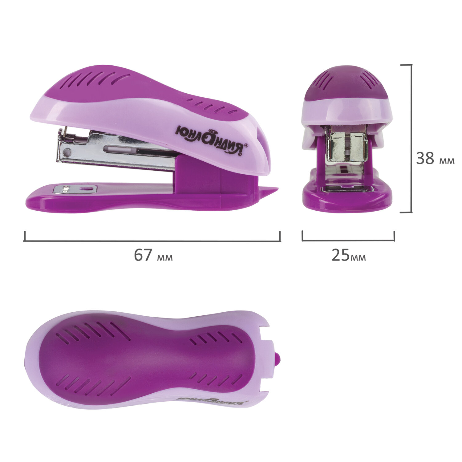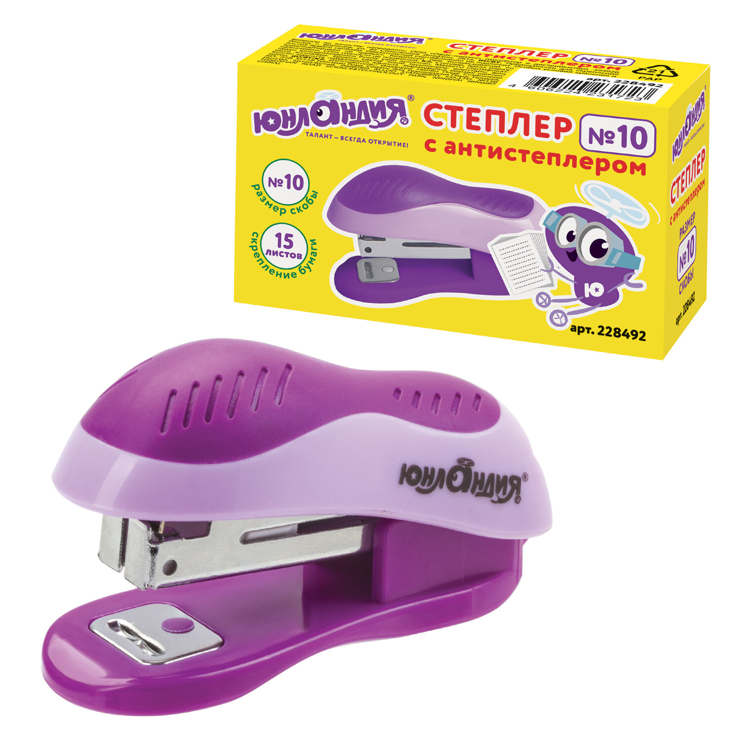- Степлер №10 МИНИ ЮНЛАНДИЯ, до 15 листов, с антистеплером, эргономичный, фиолетовый, 228492