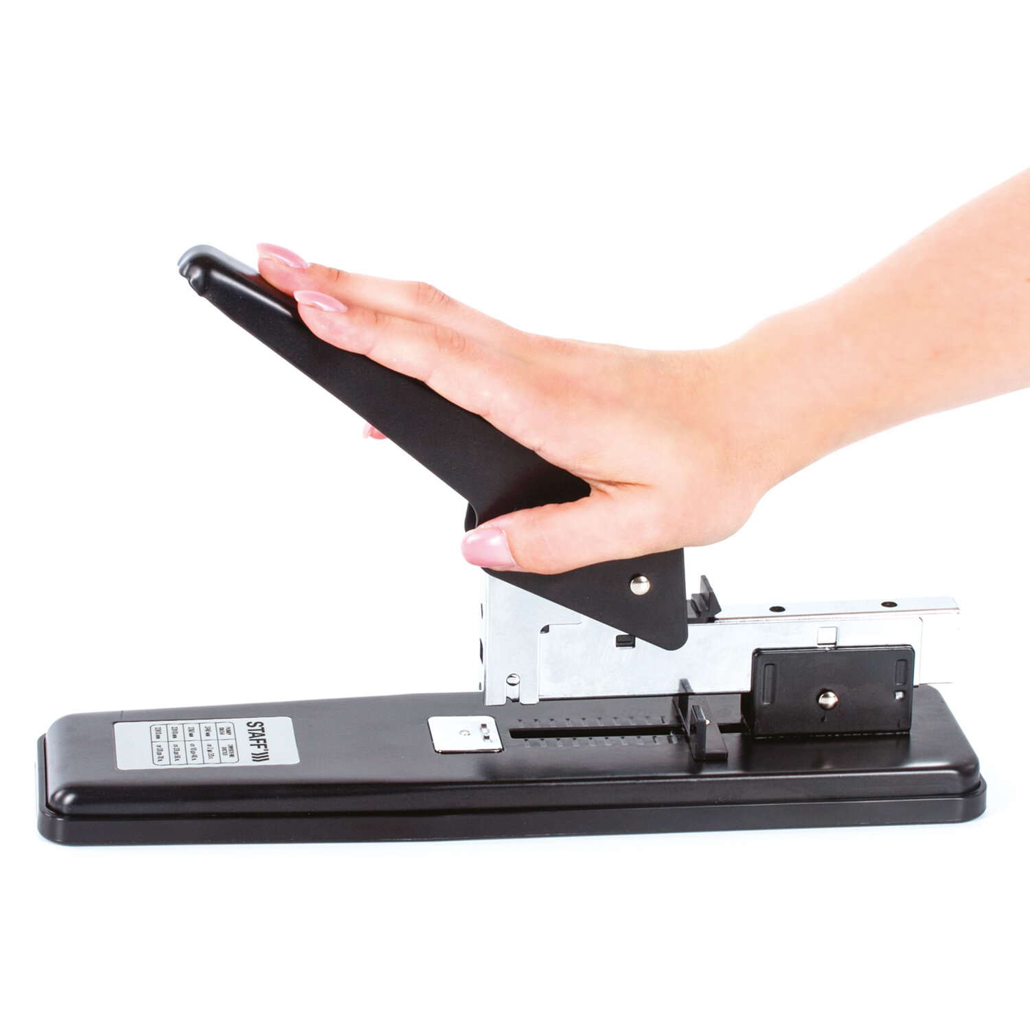 Рабочий механизм и корпус выполнены из металла черного цвета. Способен скрепить до 70 листов бумаги. Подходит для скоб № 24/6, 26/6, № 23/8, 24/8, № 23/10, № 23/13. Глубина закладки бумаги регулируется - до 72 мм. Закрытый вид сшивания. Фронтальная загрузка скоб. Степлер МОЩНЫЙ №24/6-23/13 металлический STAFF "Manager", до 70 листов, черный, 227663