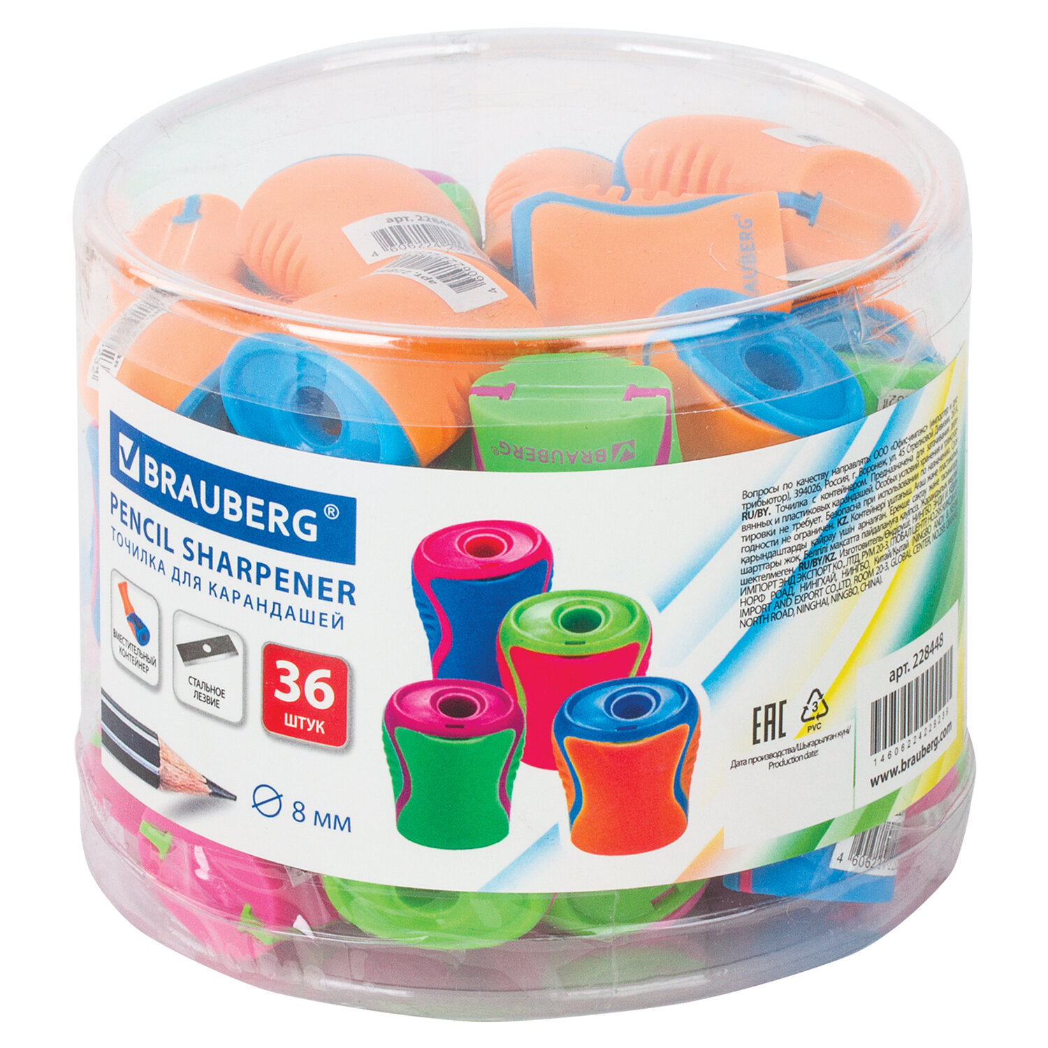 - Точилка BRAUBERG "Mix", с контейнером, пластиковая, корпус ассорти, 228448