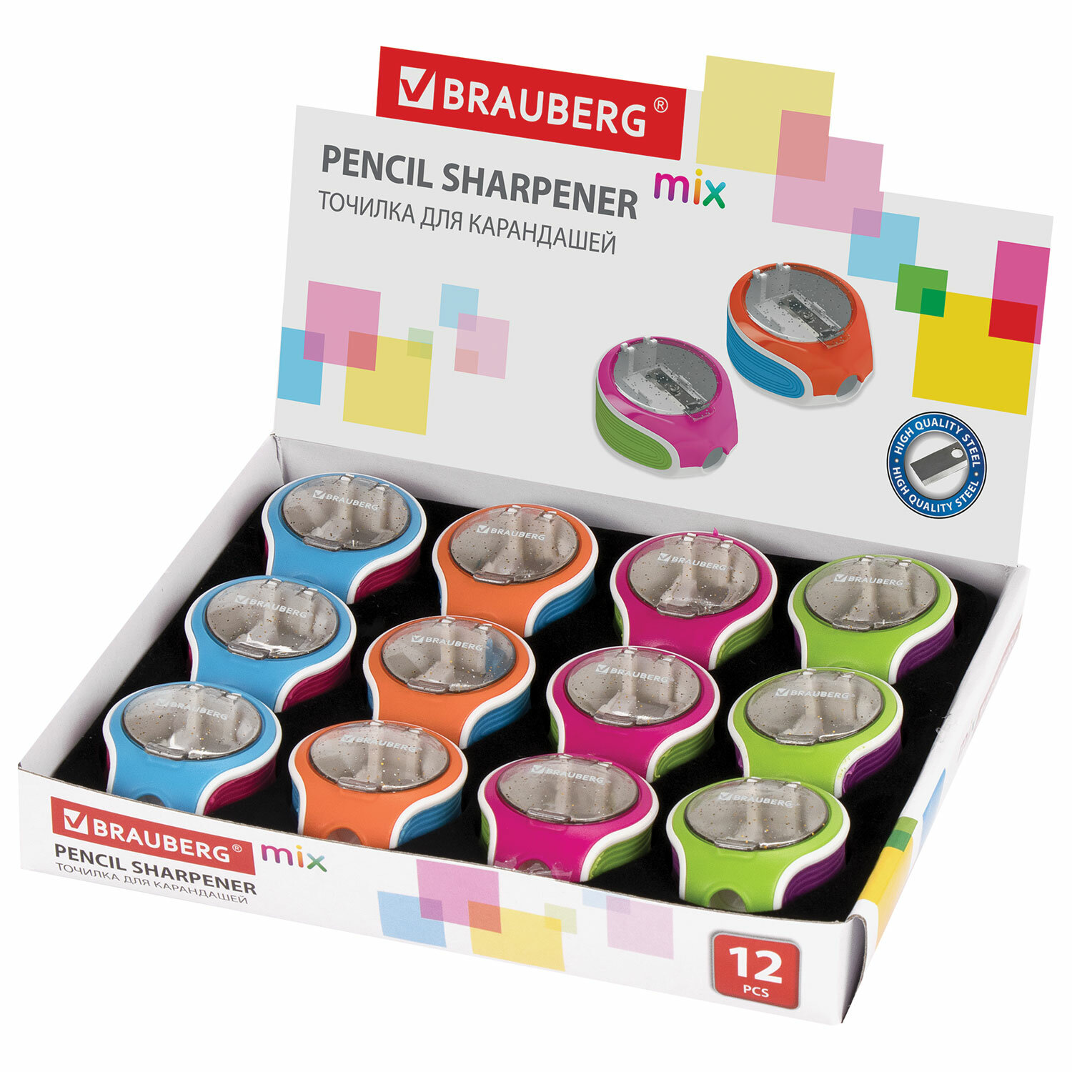 - Точилка BRAUBERG "Mix Soft", пластиковая, с контейнером, корпус ассорти, 229585