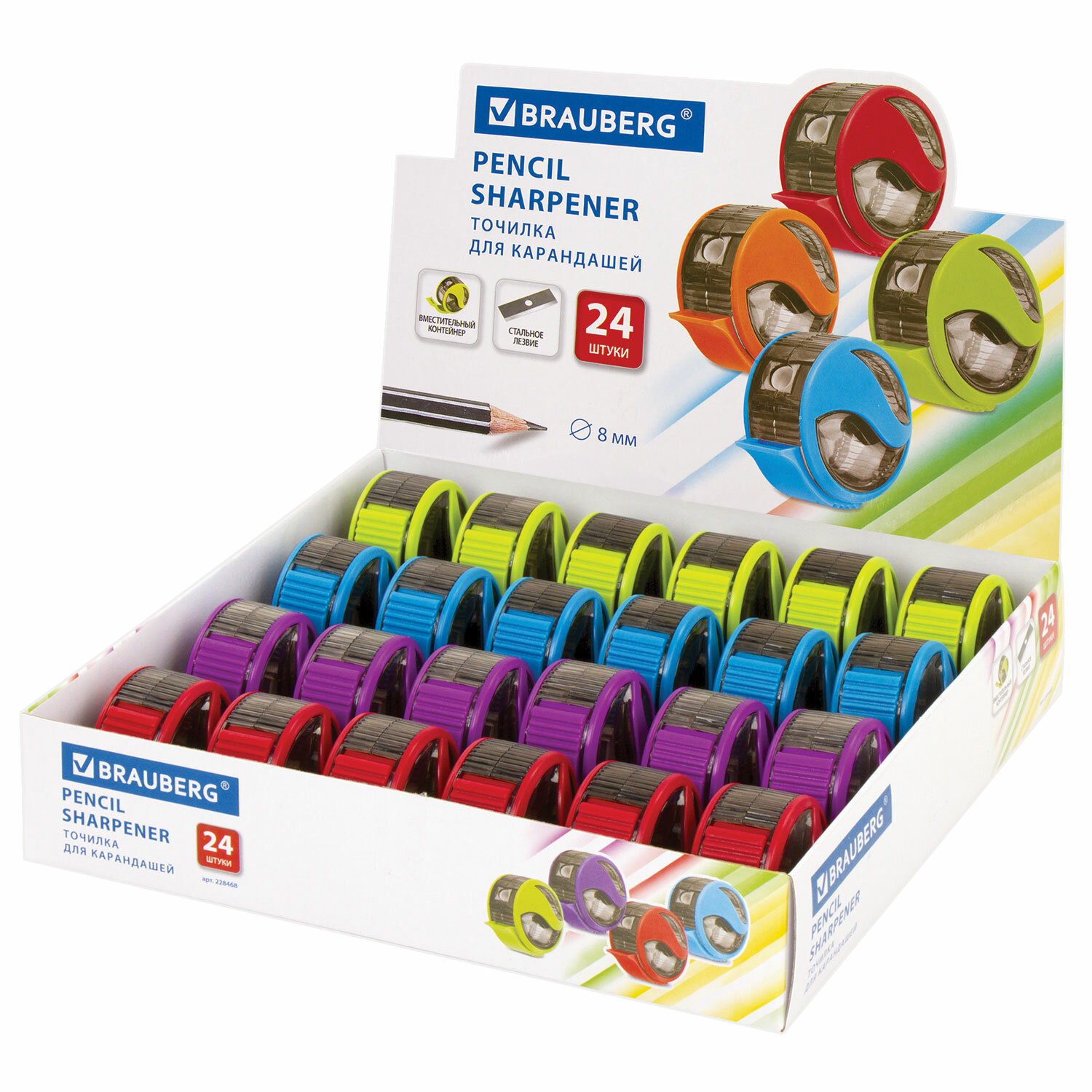 Корпус выполнен из пластика ярких цветов ассорти. Острое стальное лезвие обеспечивает быструю и легкую заточку. Карандаш затачивается аккуратно, а опилки остаются в специальном контейнере. Размер - 41х52х55 мм. Точилка BRAUBERG "Rewind", с контейнером, пластиковая, корпус ассорти, 228468