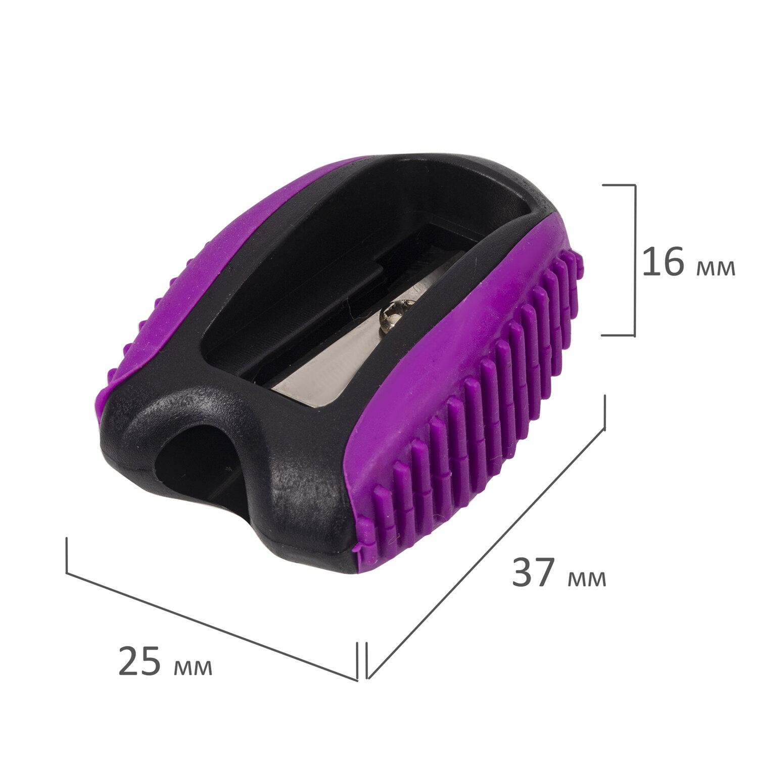 Эргономичный корпус выполнен из пластика с резиновыми вставками по бокам. Острое стальное лезвие обеспечивает быструю и легкую заточку. Карандаш затачивается аккуратно. Компактные размеры (16х25х37 мм) позволят поместить точилку в пенал, а благодаря интересной форме она не затеряется на парте или столе среди других принадлежностей.