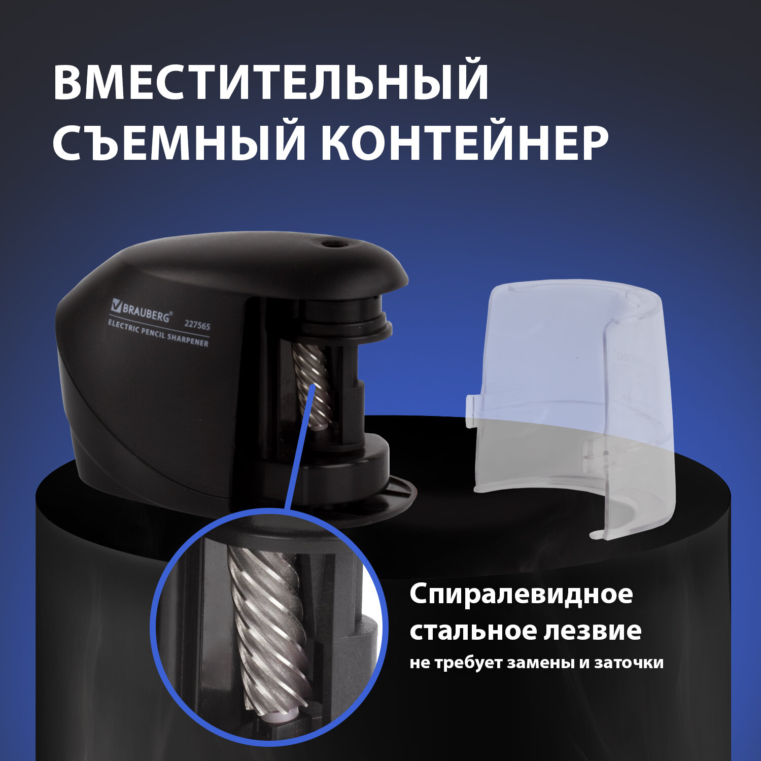 Для правильной заточки необходимо удерживать карандаш от вращения. Уже через несколько секунд он идеально заточен и готов к использованию. Точилка электрическая BRAUBERG "ORIGINAL", питание 220 В/4 батарейки АА, фрезерный механизм, 227565