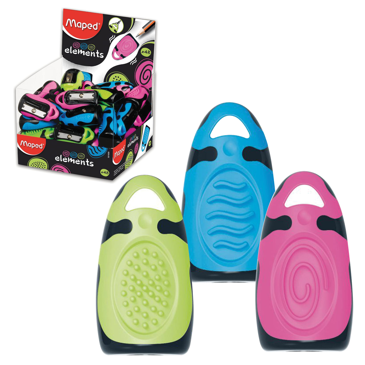 - Точилка MAPED (Франция) "Elements", без контейнера, корпус ассорти, дисплей, 501600