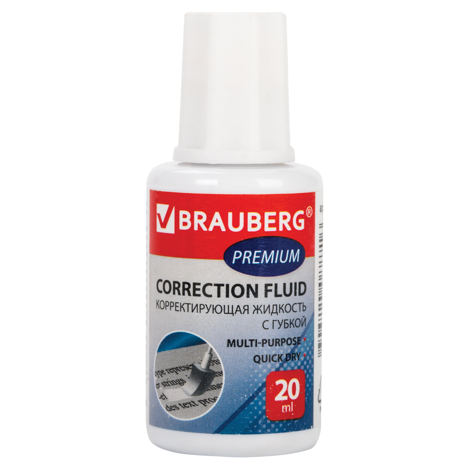 Быстро высыхает на бумаге. Морозоустойчивая. Объем флакона – 20 мл. Корректирующая жидкость BRAUBERG "Premium" быстросохнущая, 20 мл, с губчатым аппликатором, 224090