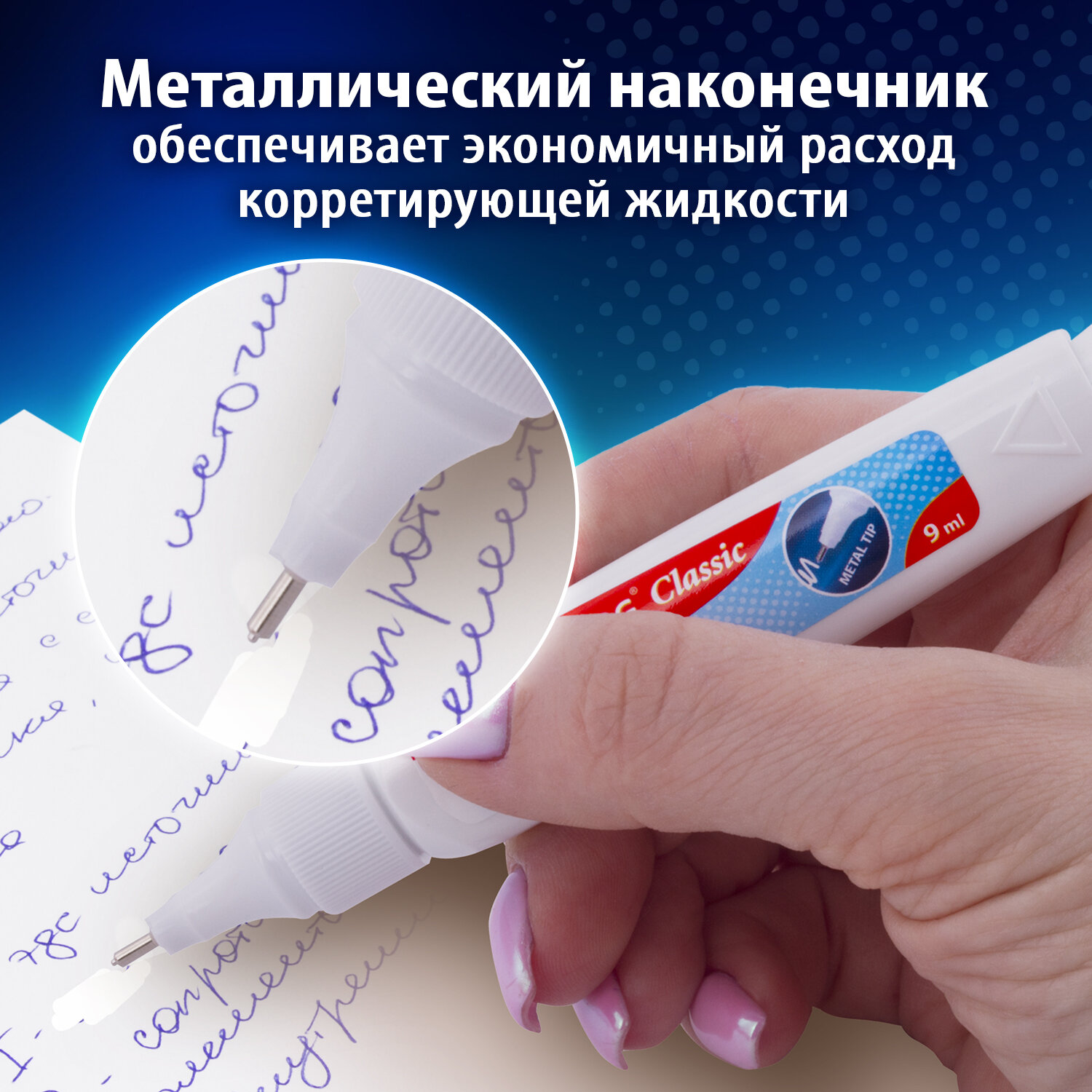 Жидкость на спиртовой основе обеспечивает быстрое высыхание и обладает морозоустойчивостью. Металлический наконечник гарантирует экономичный расход и аккуратное нанесение корректирующей жидкости на бумагу. Надежный колпачок предупреждает засыхание и продлевает срок использования.