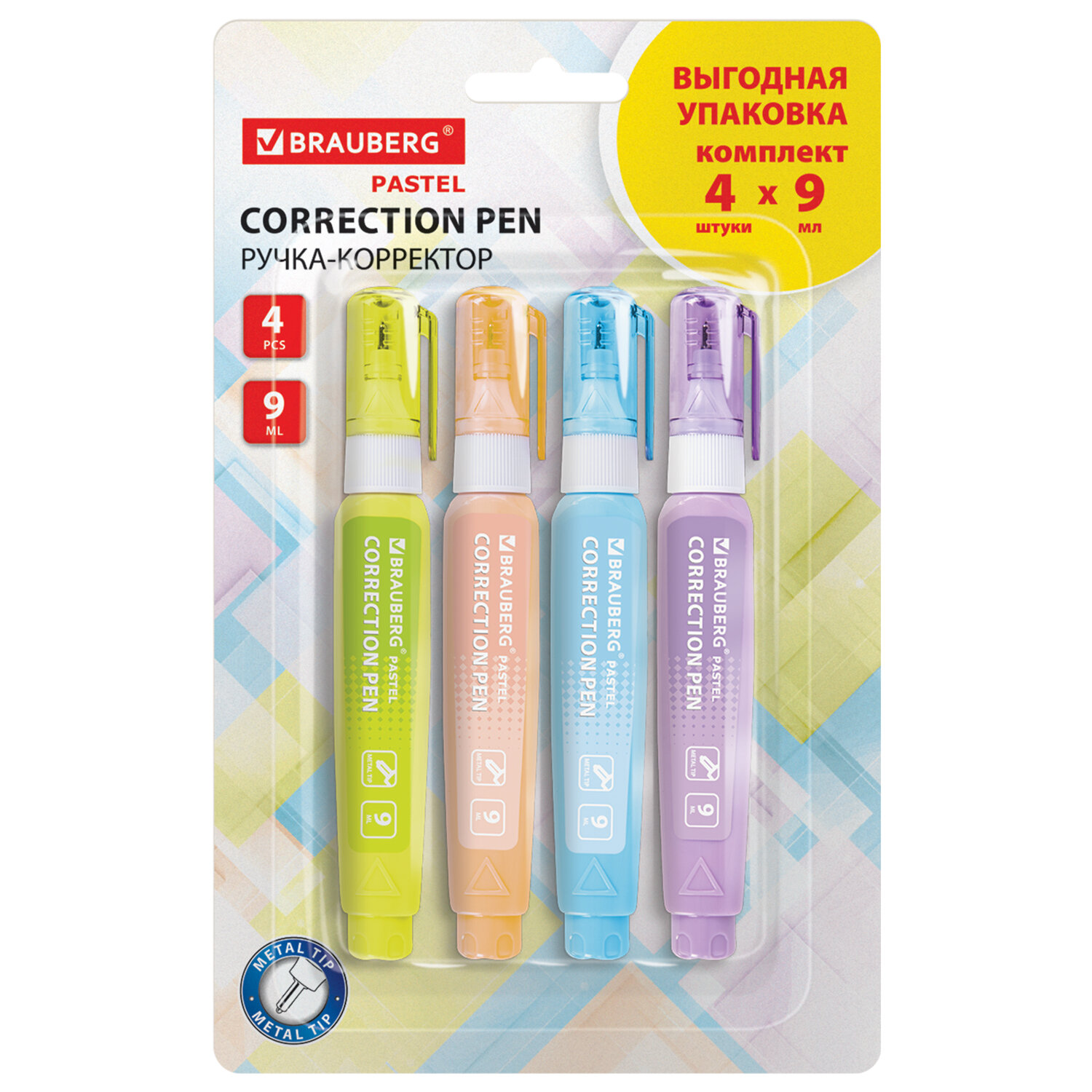 - Ручка-корректор 9 мл ВЫГОДНАЯ УПАКОВКА, КОМПЛЕКТ 4 штуки, BRAUBERG PASTEL, 271922