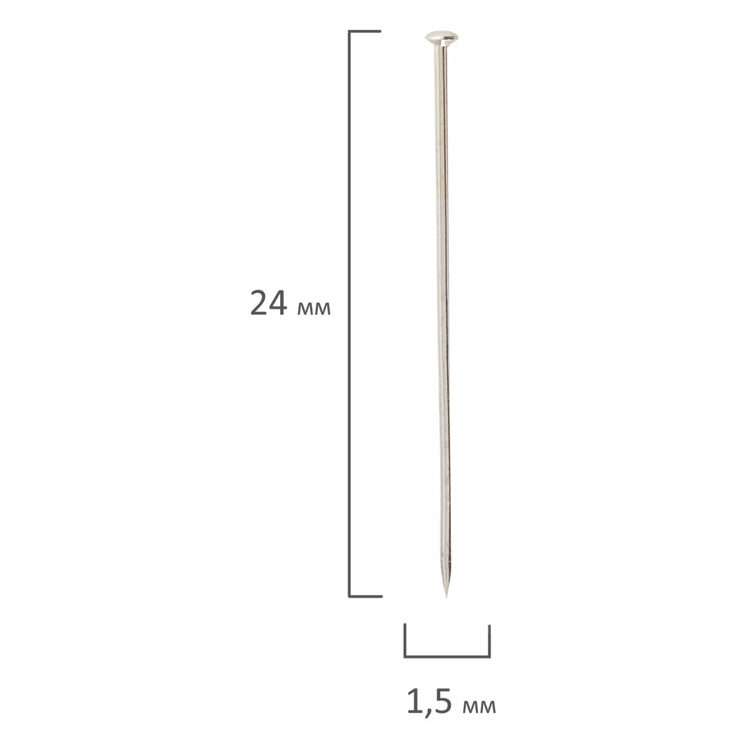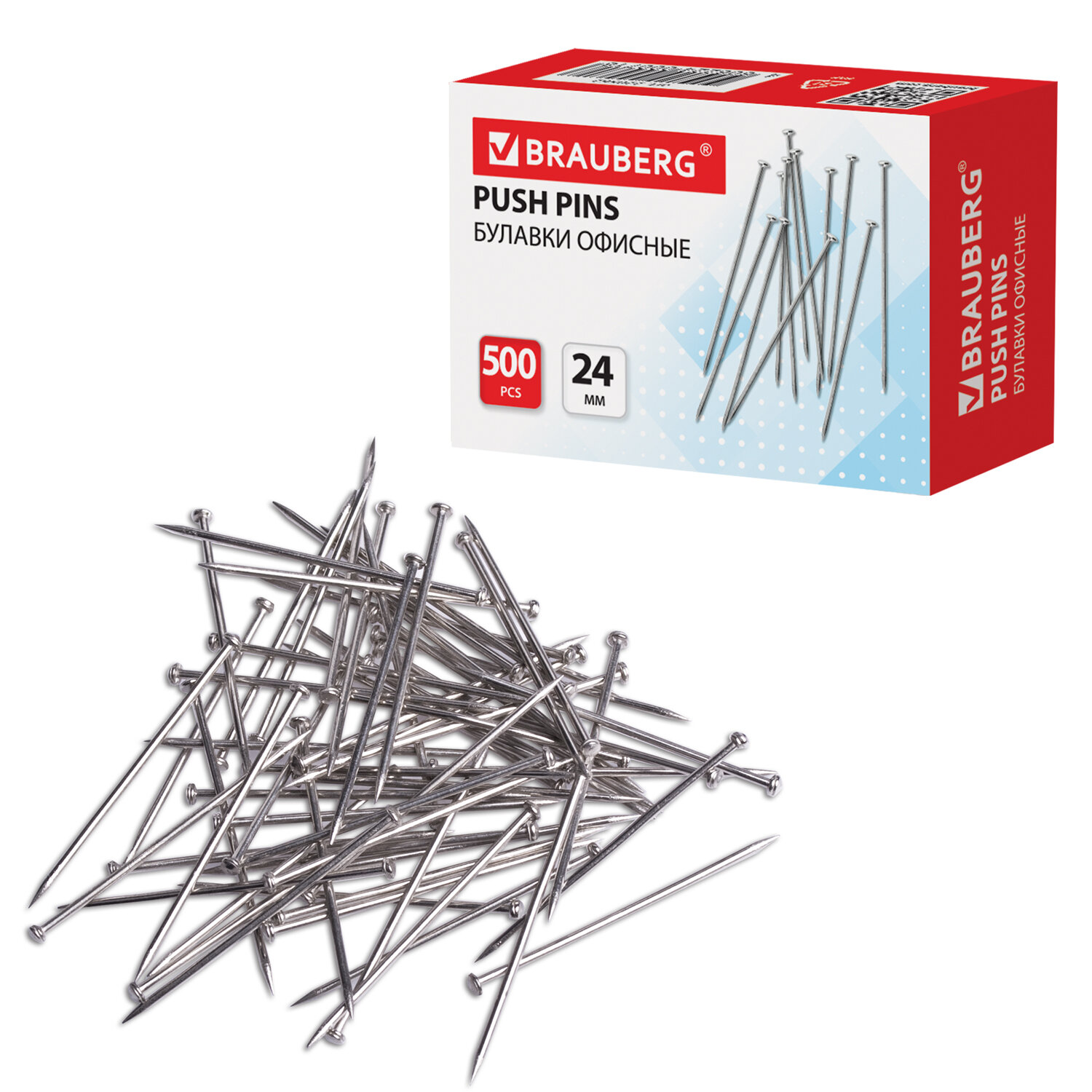 Булавки размером 24 мм изготовлены из металла. 500 штук в картонной упаковке. Булавки универсальные BRAUBERG, 24 мм, 500 штук, в картонной коробке, 220562