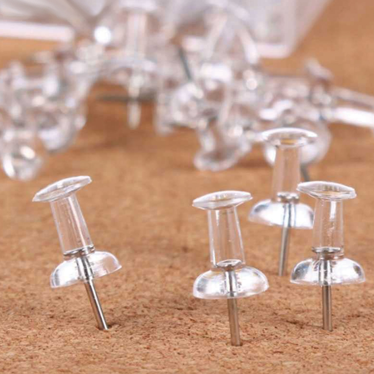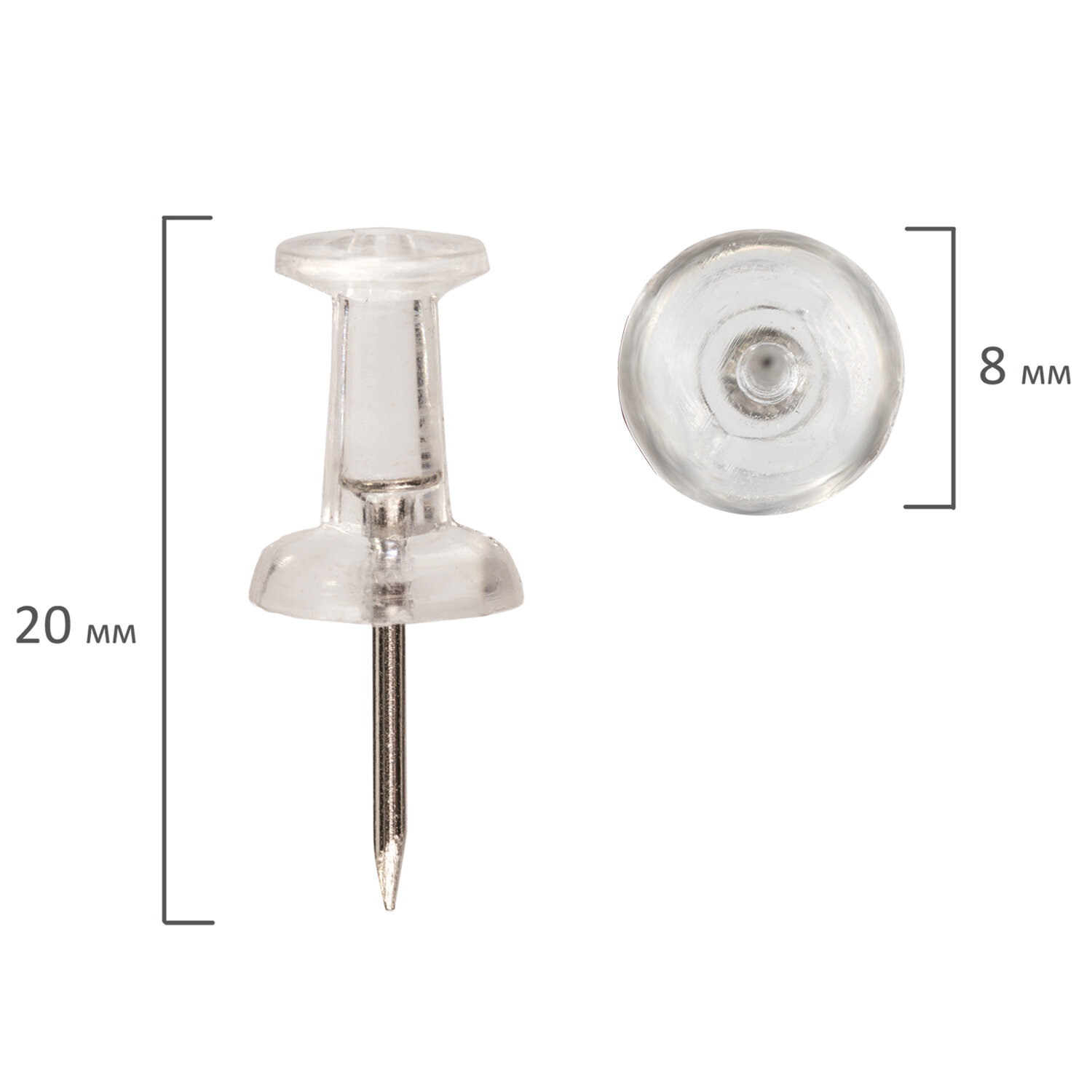 Кнопки с прозрачной пластиковой шляпкой диаметром 8 мм и стальным острием длиной 10 мм. 50 штук в картонной коробке. Силовые кнопки-гвоздики прозрачные STAFF 50 штук, в картонной коробке, 227804
