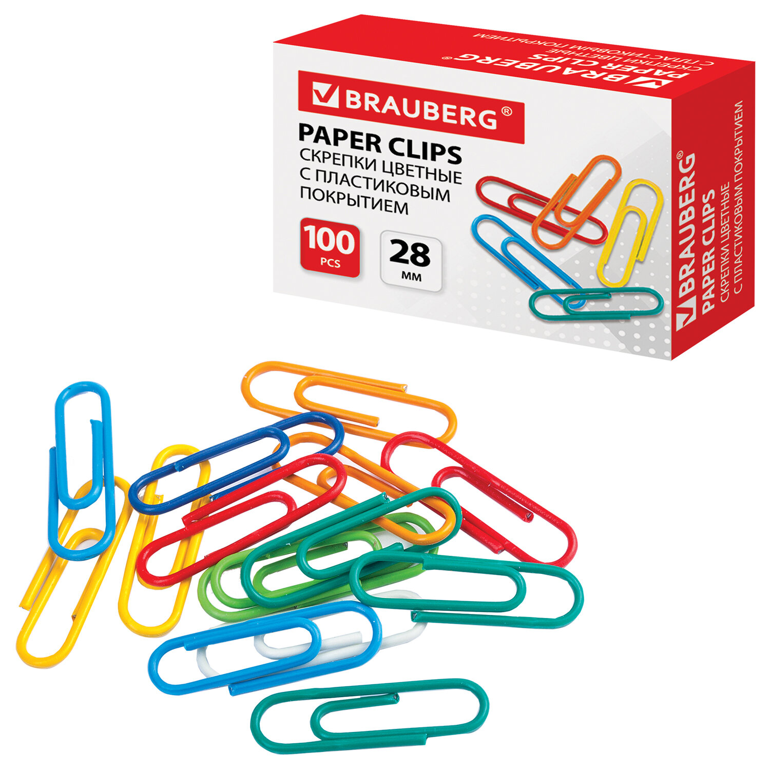 - Скрепки BRAUBERG, 28 мм, цветные, 100 шт., в картонной коробке, Россия, 220555