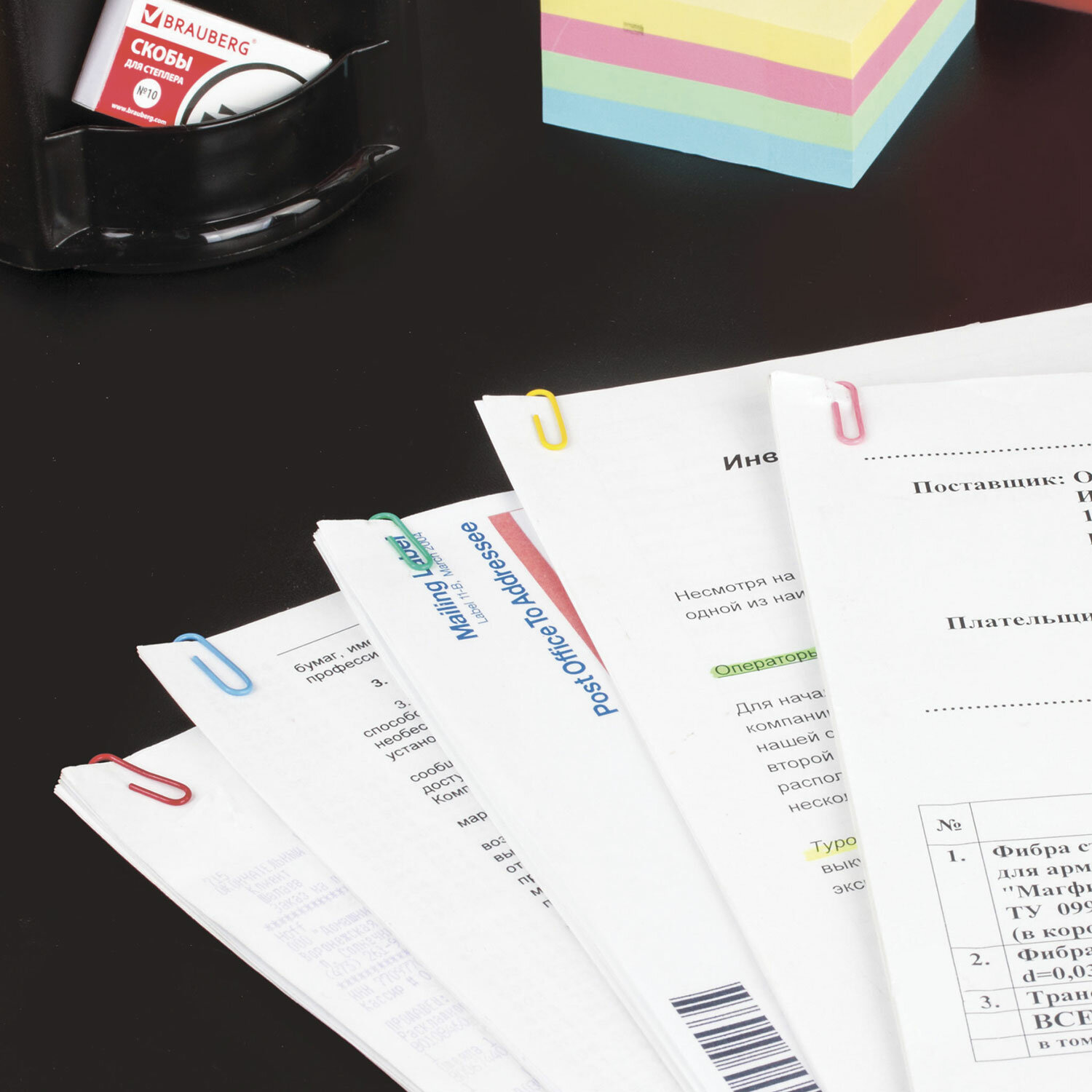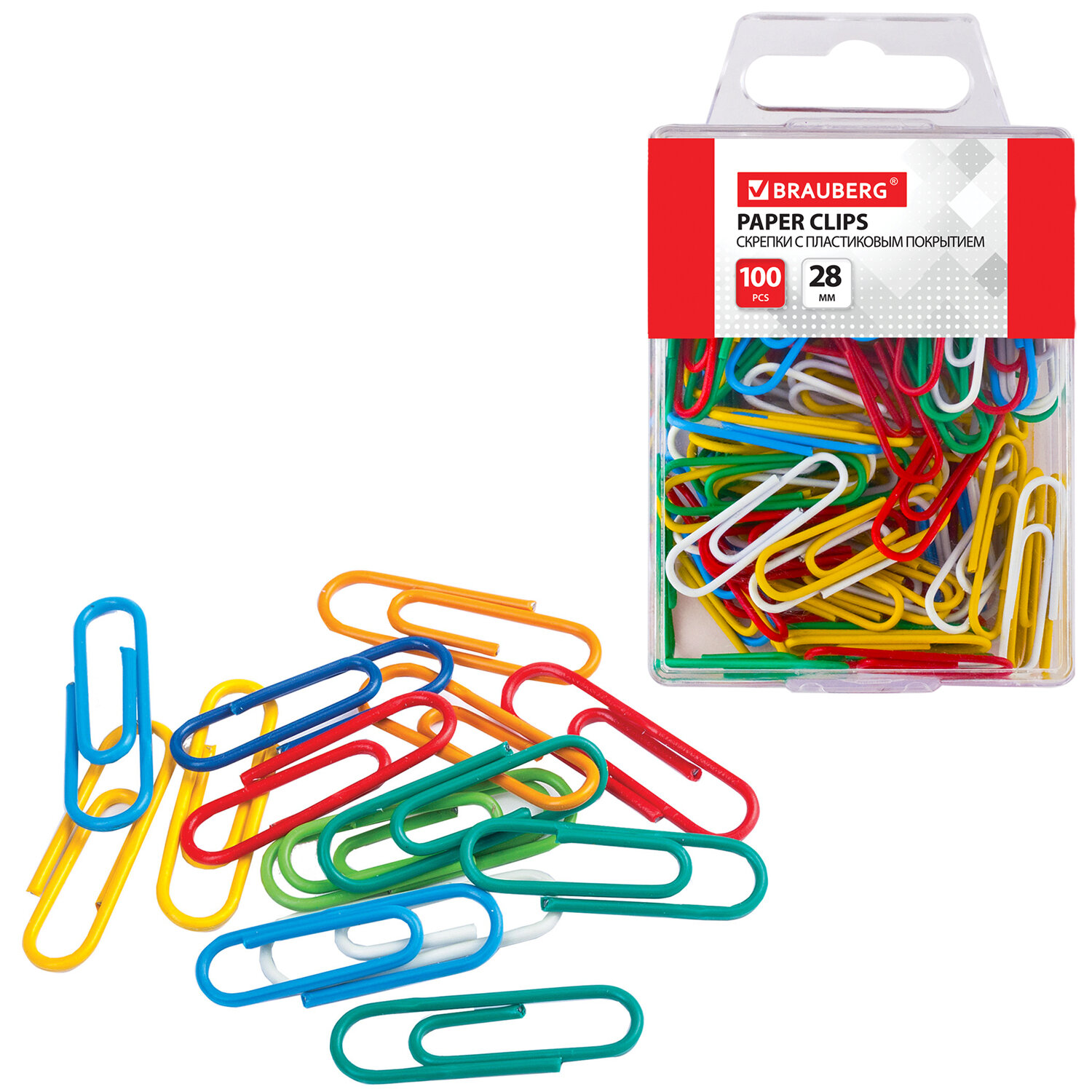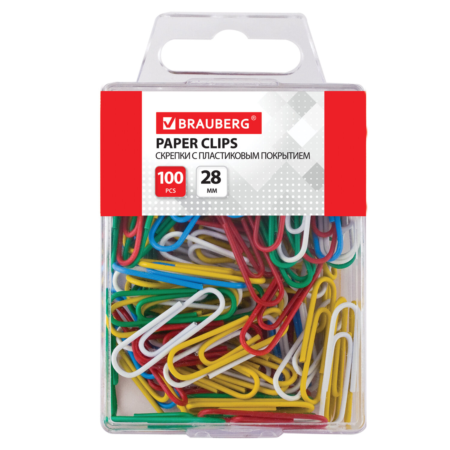 - Скрепки BRAUBERG, 28 мм, цветные, 100 шт., в пластиковой коробке, 221111