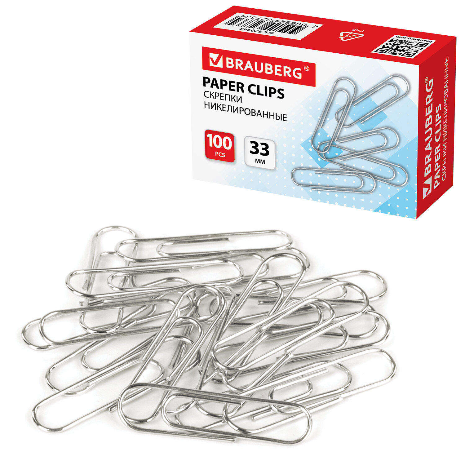 - Скрепки BRAUBERG, 33 мм, никелированные, 100 шт., в картонной коробке, 270443