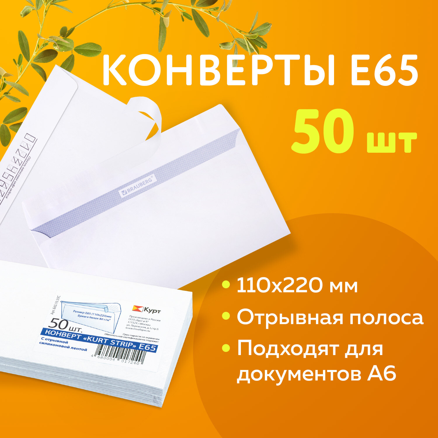 - Конверты Е65 (110х220 мм), отрывная лента, белые, КОМПЛЕКТ 50 шт., внутренняя запечатка, Е65.10.50С