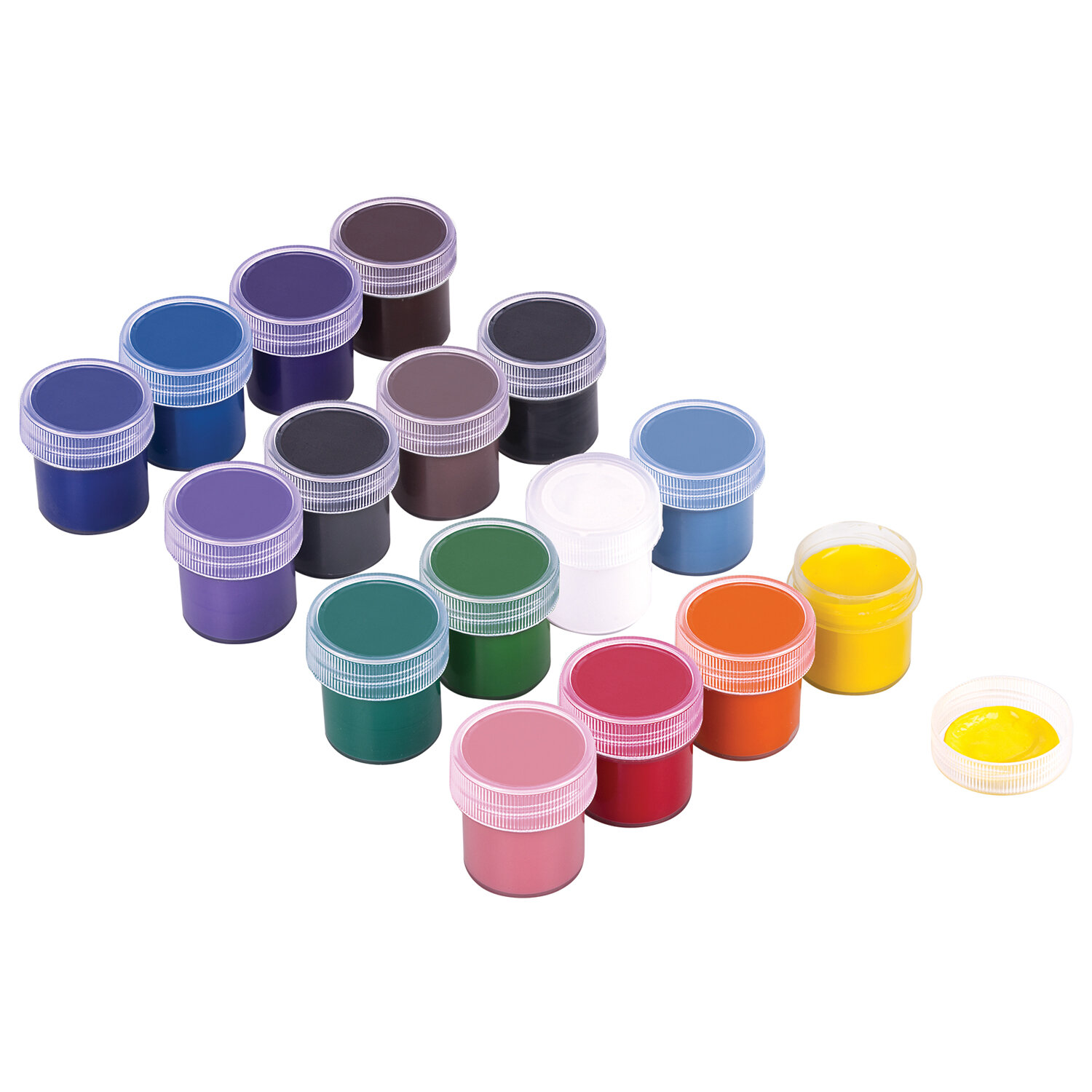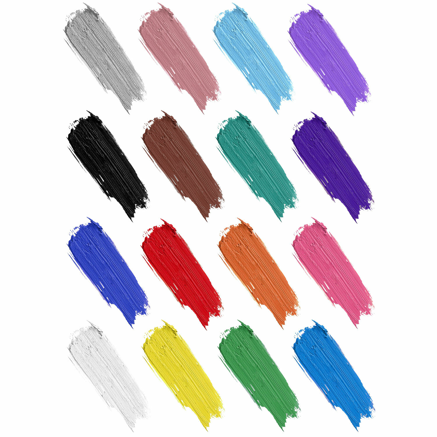 В наборе 16 ярких и насыщенных цветов: белый, красный, черный, синий, желтый, зеленый, коричневый, оранжевый, фиолетовый, светло-зеленый, голубой, розовый, красно-коричневый, охра, кармин, темно-зеленый.