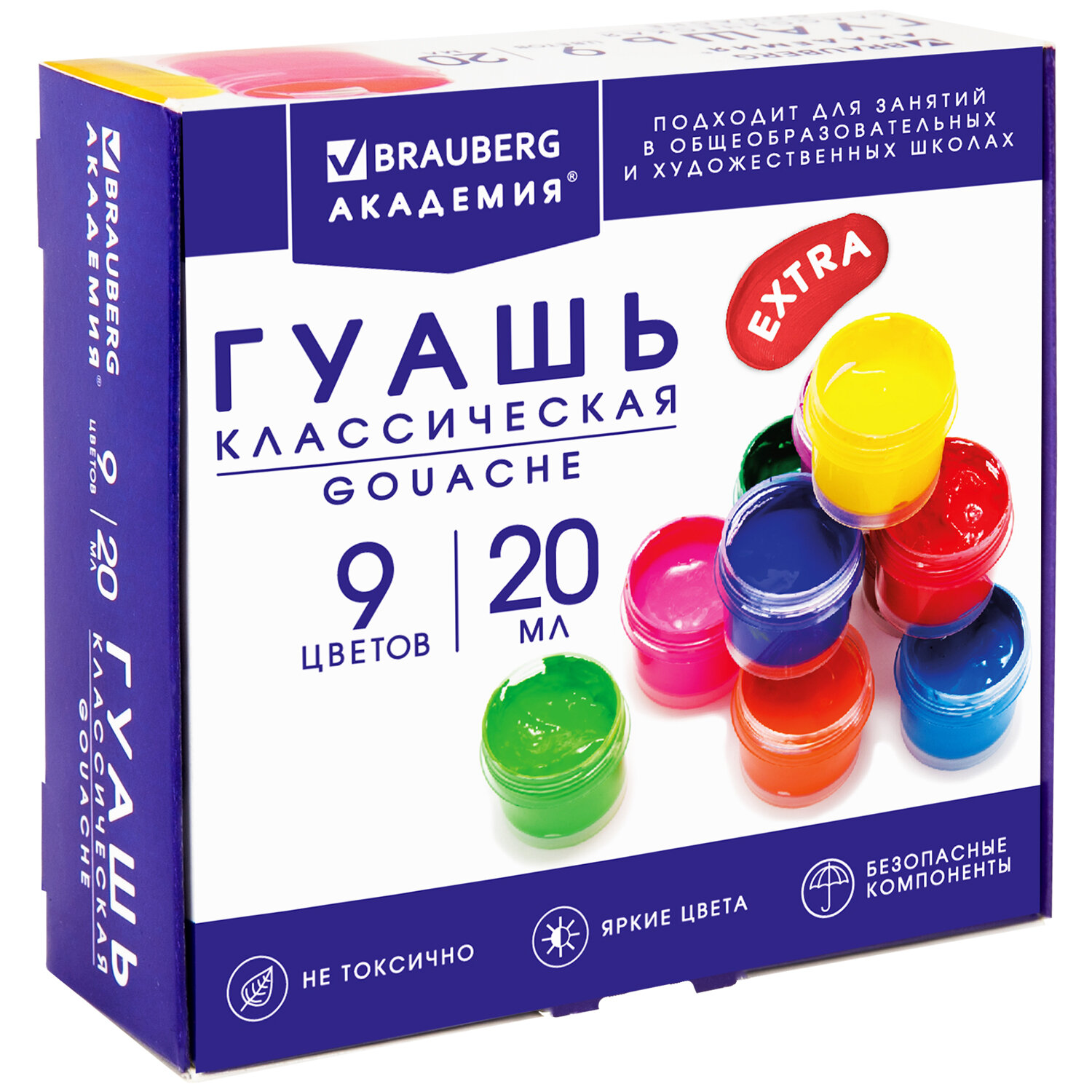 Гуашь BRAUBERG "АКАДЕМИЯ КЛАССИЧЕСКАЯ ЭКСТРА", 9 цветов по 20 мл, 192372