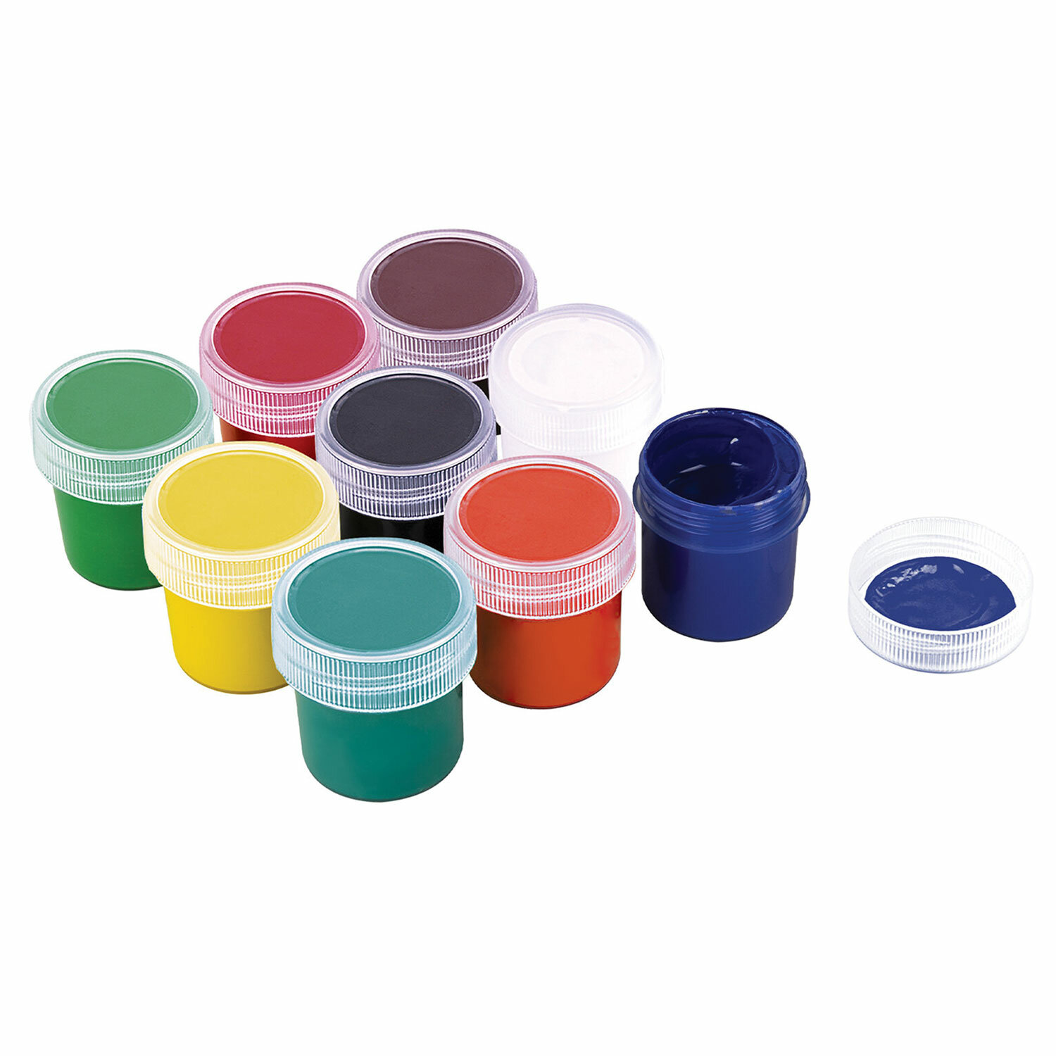В наборе 9 ярких и насыщенных цветов: белый, черный, красный, синий, желтый, зеленый, коричневый, оранжевый, фиолетовый.
