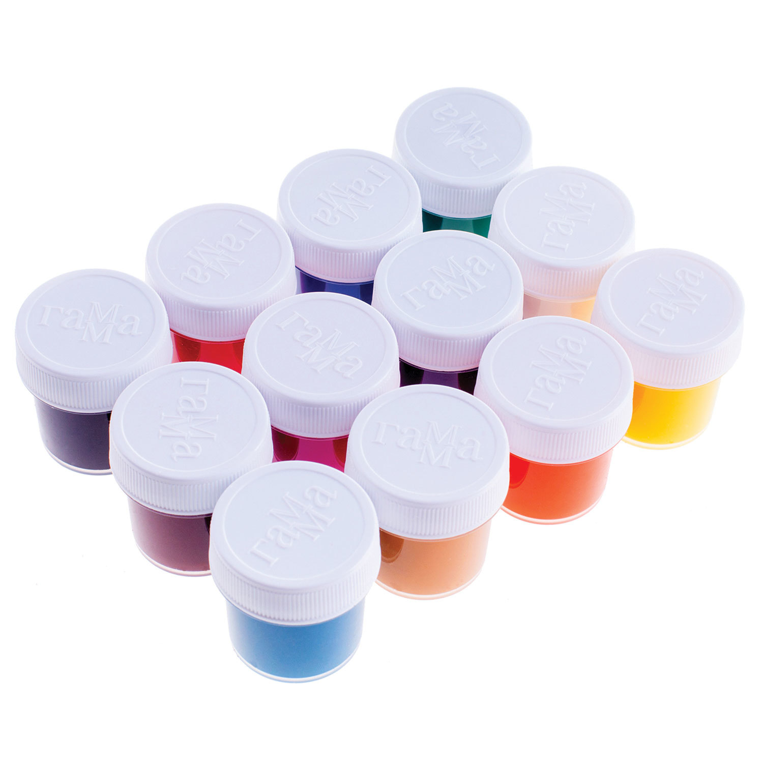Состав набора: алая, белая, бирюзовая, желтая, зеленая, коричневая, оранжевая, охра золотистая, розовая, синяя темная, фиолетовая, черная. Гуашь ГАММА "Мультики", 12 цветов по 20 мл, картонная упаковка, 221032