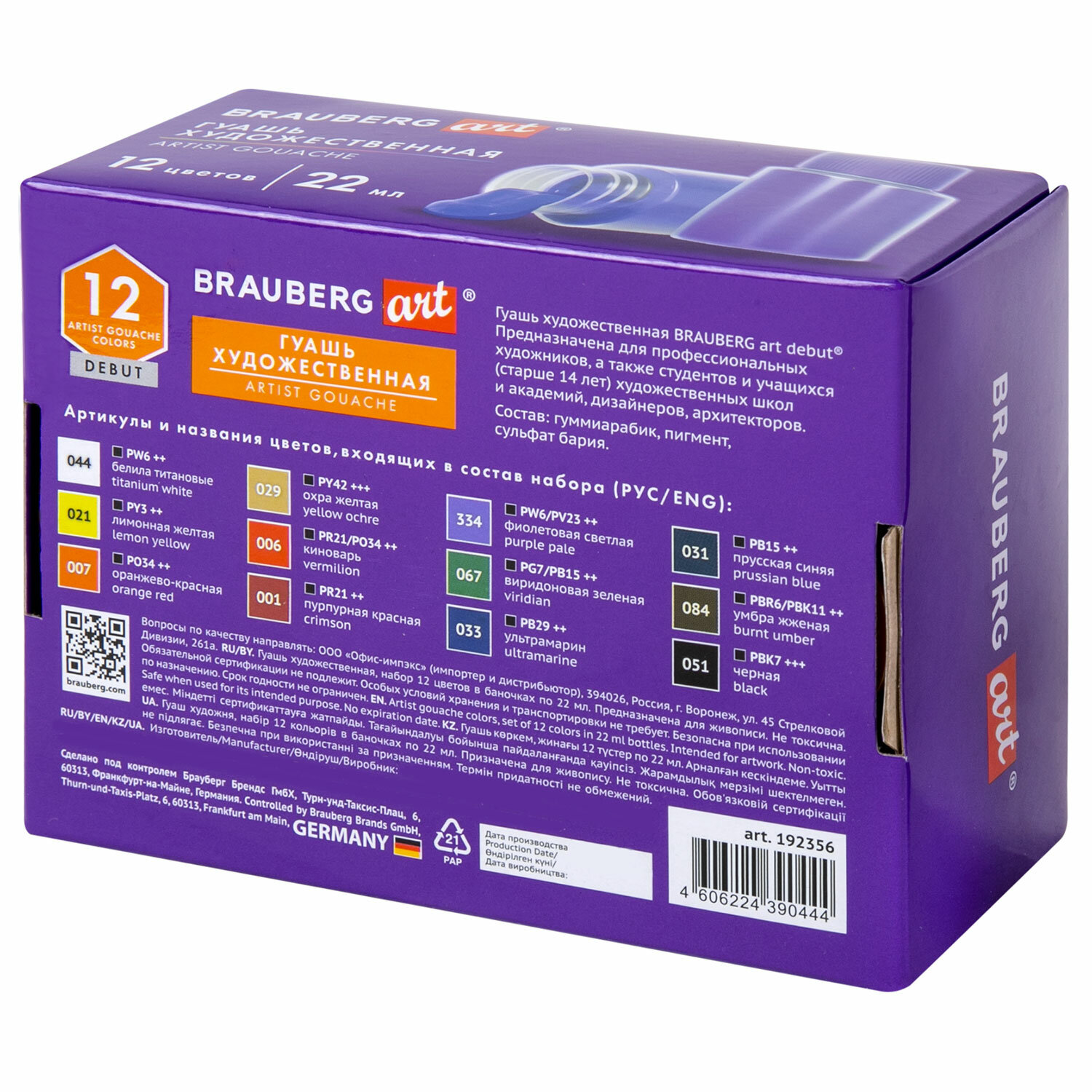 Художественные гуашевые краски, представленные широкой цветовой гаммой, пригодятся как канцтовары школьникам, студентам, участникам мастер-классов, ученикам художественных школ, студий и училищ, живописных мастерских. Отлично подойдут для работы дома или на пленэре. С помощью художественной гуаши можно создать даже иллюстрации к сонетам Шекспира. Эту гуашь используют любители для хобби, которые стремятся достичь такой же славы как Пикассо (Picasso), Малевич, Шагал, Моне (Claude Monet), Рембрандт (Rembrandt), Дали (Salvador Dali), Уорхол (Andy Warhol), Рублёв, Фрида Кало (Frida Kahlo), Ван Гог (Vincent van Gogh), Тициан ( Tician), Анри Матисс (Henri Matisse), Леонардо да Винчи (Leonardo da Vinci) и другие популярные художники. Творчество – луч света в серых буднях! Гуашь художественная НАБОР 12 цветов по 22 мл, с гуммиарабиком, BRAUBERG ART DEBUT, 192356