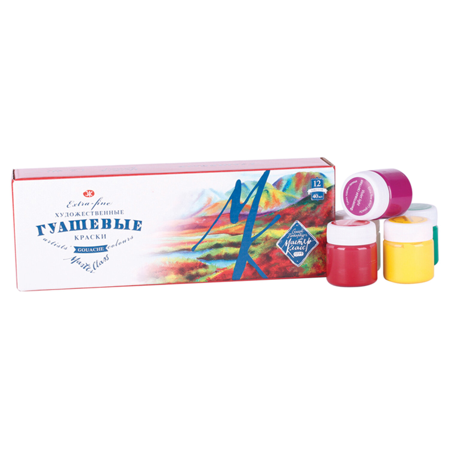 Обладает 12 насыщенными цветами, среди которых белила цинковые или белила титановые, желтая светлая, охра светлая или охра золотистая, краплак красный или охра красная или английская красная, красная, бирюзовая или лазурь железная, ультрамарин, фиолетовая темная или фиолетовая светлая, ярко-зеленая или изумрудная зеленая, зеленая темная, умбра жженая, сажа газовая. 12 баночек объемом 40 мл. Изготавливается из тонко тертых пигментов и связующего с добавлением гуммиарабика, благодаря которому краска получает высокую кроющую способность, отличается бархатистостью и матовостью. ПОставляется в картонной коробке. Гуашь художественная "Мастер-класс", 12 цветов по 40 мл, Невская Палитра, 1741010