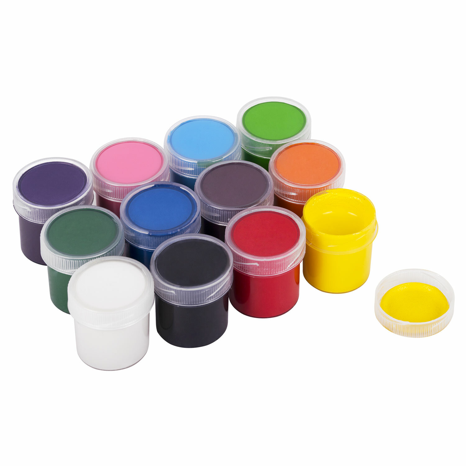 В наборе 12 ярких цветов: белый, черный, красный, желтый, синий, зеленый, оранжевый, фиолетовый, голубой, розовый, светло-зеленый, коричневый.