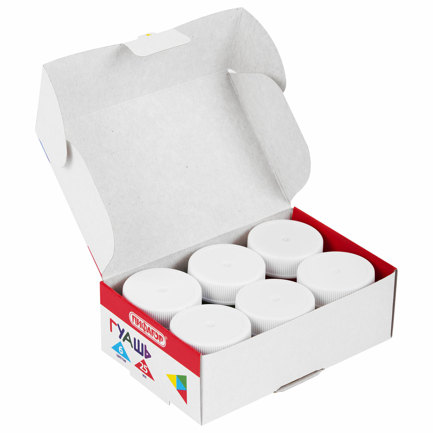 Краска находится в пластмассовой герметичной баночке объемом 25 мл. Общий объем – 150 мл. Ребенок сможет легко открыть баночки с винтовыми крышками без помощи взрослых. Гуашь ПИФАГОР "СОЛНЫШКО", 6 цветов по 25 мл, 192645