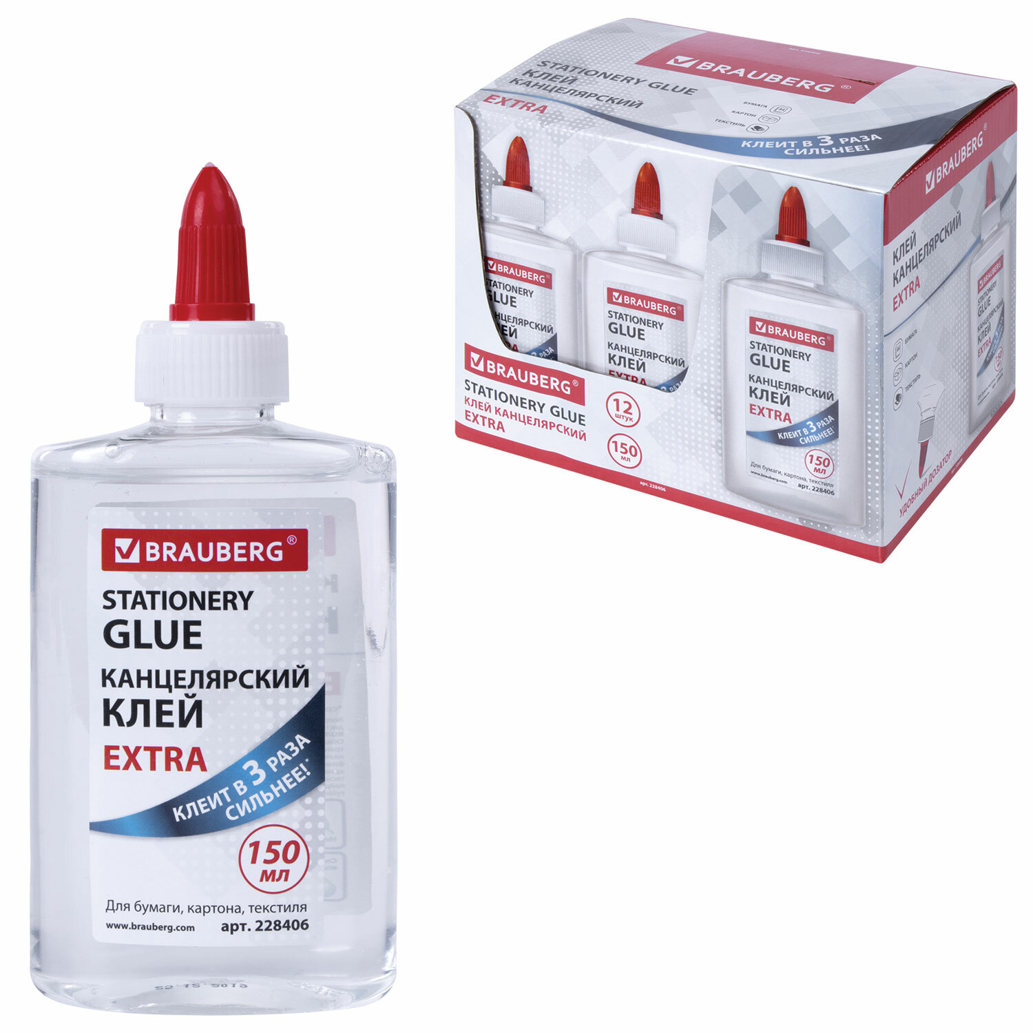 - Клей канцелярский EXTRA BRAUBERG, 150 мл, с дозатором, 228406
