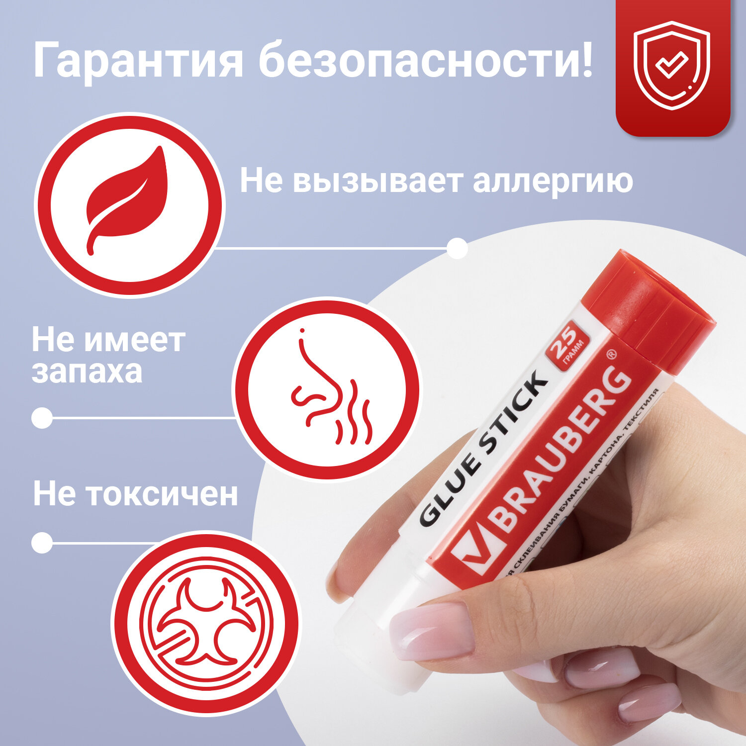 После нанесения высыхает без образования пятен. Не токсичен, не вызывает аллергии и безопасен для здоровья. Легко наносится и распределяется по поверхности, оставляя тонкий и ровный клеевой слой, что позволяет расходовать его экономично. Клей удобен в использовании. Он не пачкает руки, стол, одежду, не попадает на участки бумаги, расположенные возле места склеивания. Увеличенный срок годности — 5 лет. Клей-карандаш 25 г ВЫГОДНАЯ УПАКОВКА, КОМПЛЕКТ 12 штук, BRAUBERG, 229470