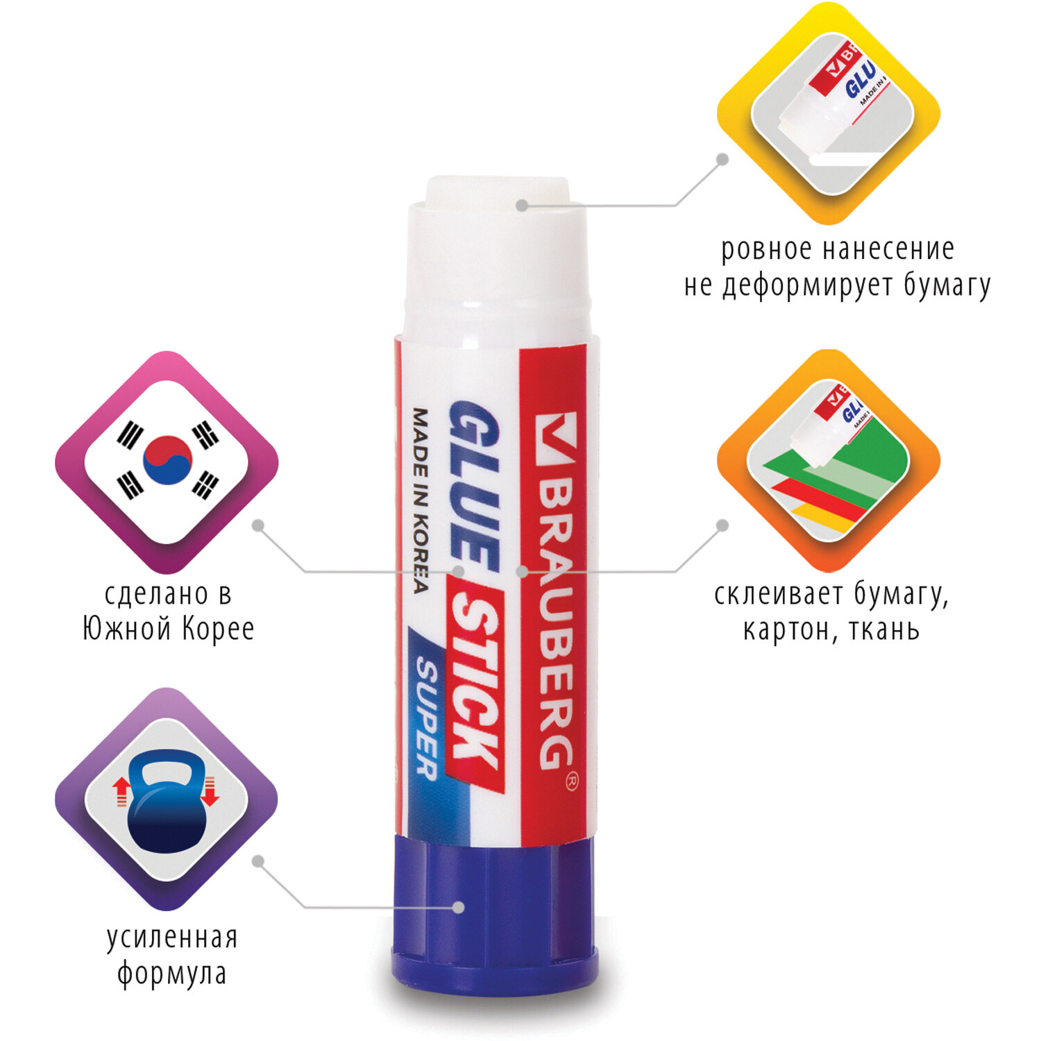 Изготовлен одним из ведущих производителей клея в Южной Корее. После нанесения высыхает без образования пятен. Не токсичен, не вызывает аллергии и безопасен для здоровья. Легко наносится и распределяется по поверхности, оставляя тонкий и ровный клеевой слой, что позволяет расходовать его экономично. Не пачкает руки, стол, одежду, не попадает на участки бумаги, расположенные возле места склеивания. Обеспечивает быстрое и надежное склеивание. Увеличенный срок годности — 5 лет. Объем - 8 г. Клей-карандаш BRAUBERG SUPER, 8 г, ЮЖНАЯ КОРЕЯ, 229540
