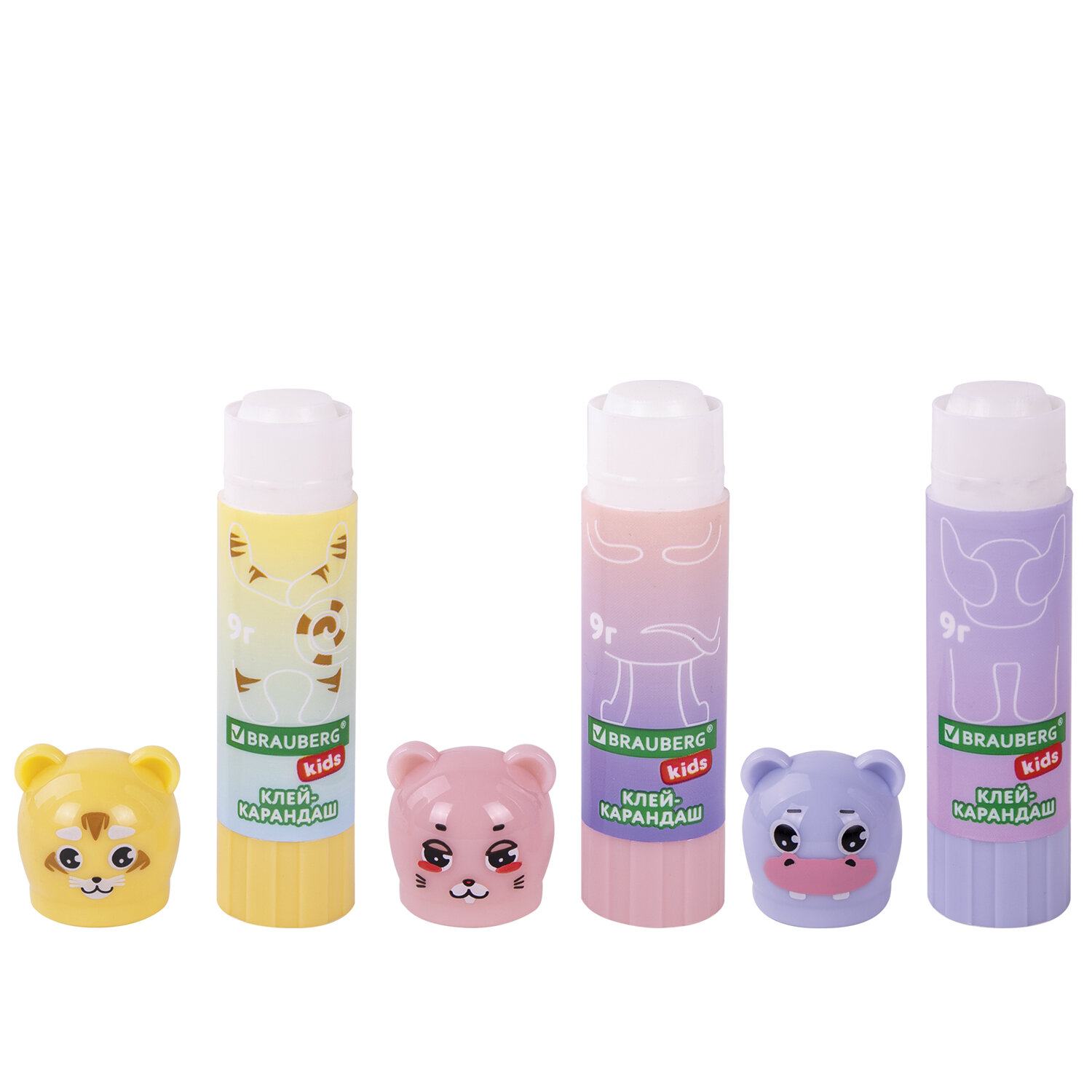 - Клей-карандаш "Пастельные зверята: мышка, тигр, бегемот", 9 г, фигурный колпачок, BRAUBERG KIDS, 271140