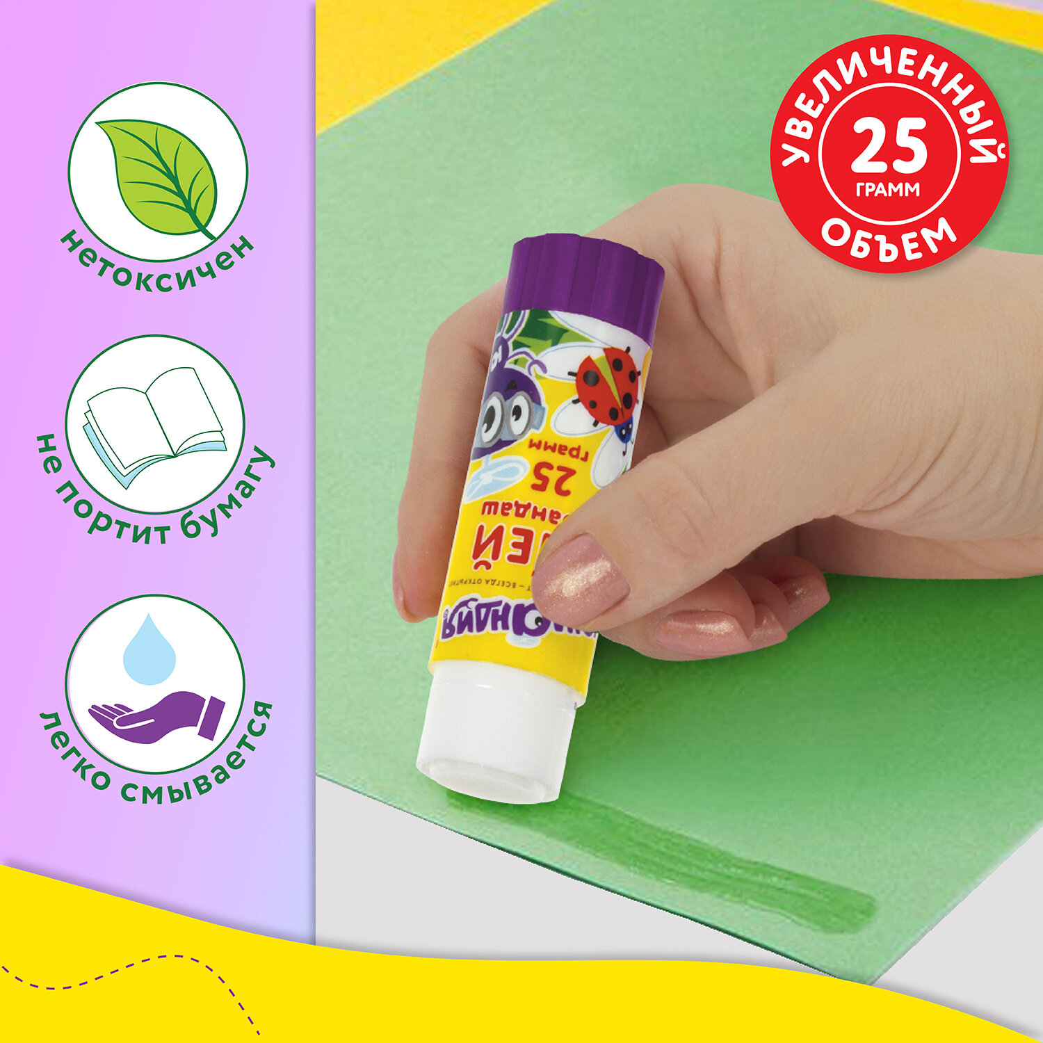 Клей-карандаш ЮНЛАНДИЯ – это надежное и быстрое склеивание, которое достигается за счет улучшенной PVP-основы клея. Он удобен в использовании, в том числе для детей: не пачкает руки, стол, одежду, не попадает на участки бумаги, расположенные возле места склеивания. После нанесения высыхает без образования пятен. Клей-карандаш не токсичен, не вызывает аллергии и безопасен для здоровья. Увеличенный объем – 25 г. Срок годности – 3 года. Клей-карандаш ЮНЛАНДИЯ "ЮНЛАНДИК И БОЖЬЯ КОРОВКА", 25 г, улучшенный, 227612
