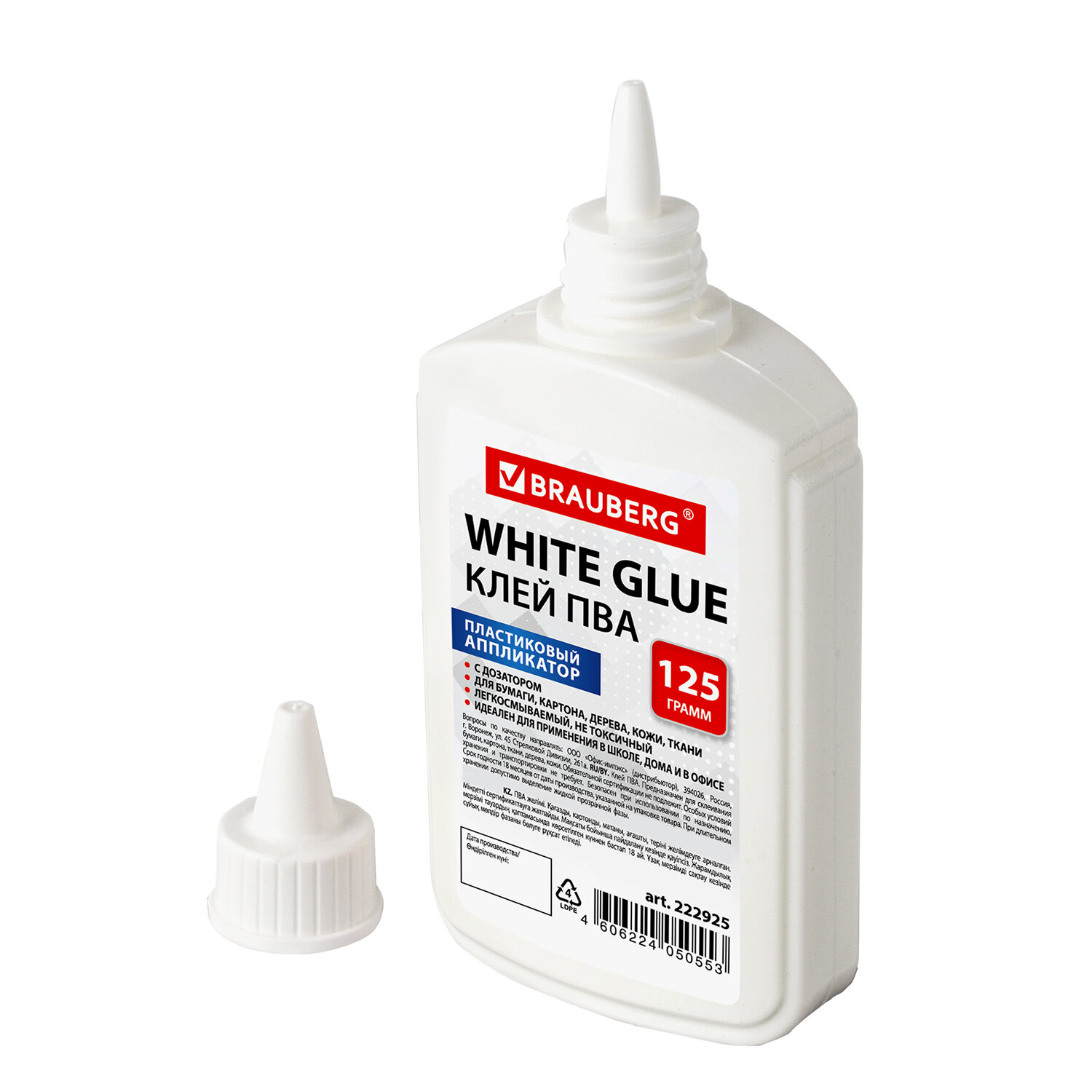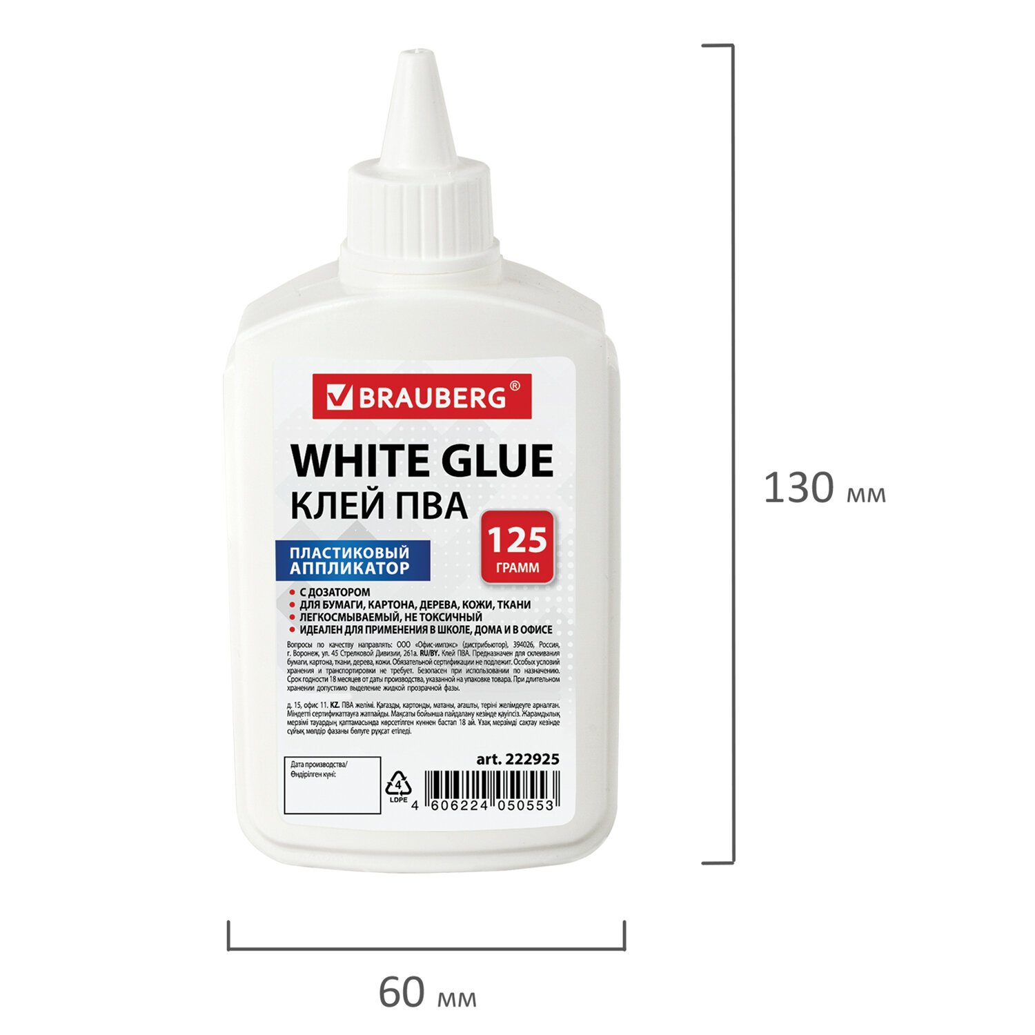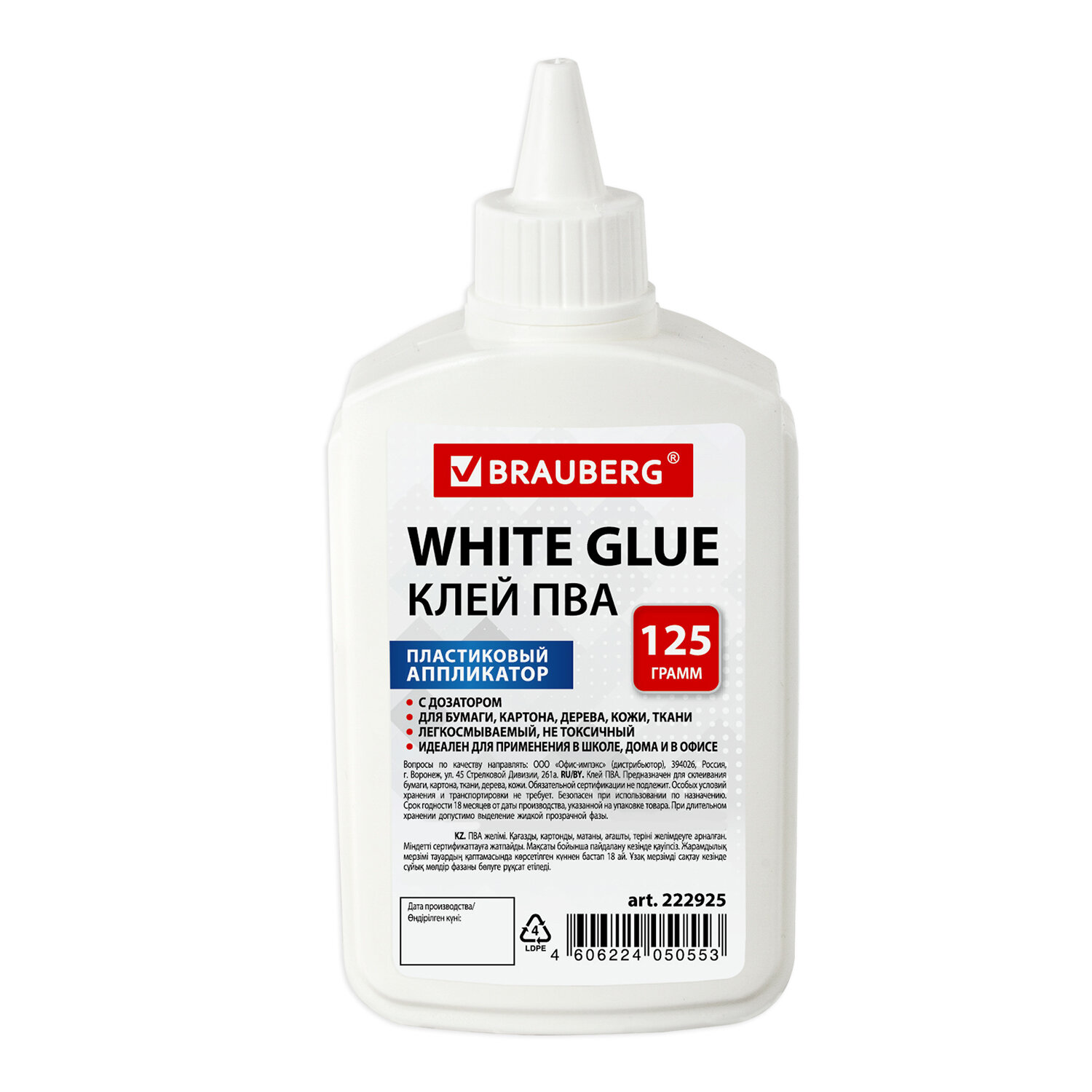 Имеет объем 125 мл. Пластиковый дозатор обеспечивает точное и равномерное нанесение. Обладает устойчивостью к морозу, не токсичен. Наносится тонким слоем, обеспечивая быстрое схватывание поверхностей, а также экономичное расходование. Съемный колпачок предохраняет клей от засыхания. Необходимо взболтать перед применением. Клей ПВА BRAUBERG (бумага, картон, дерево), 125 г, 222925
