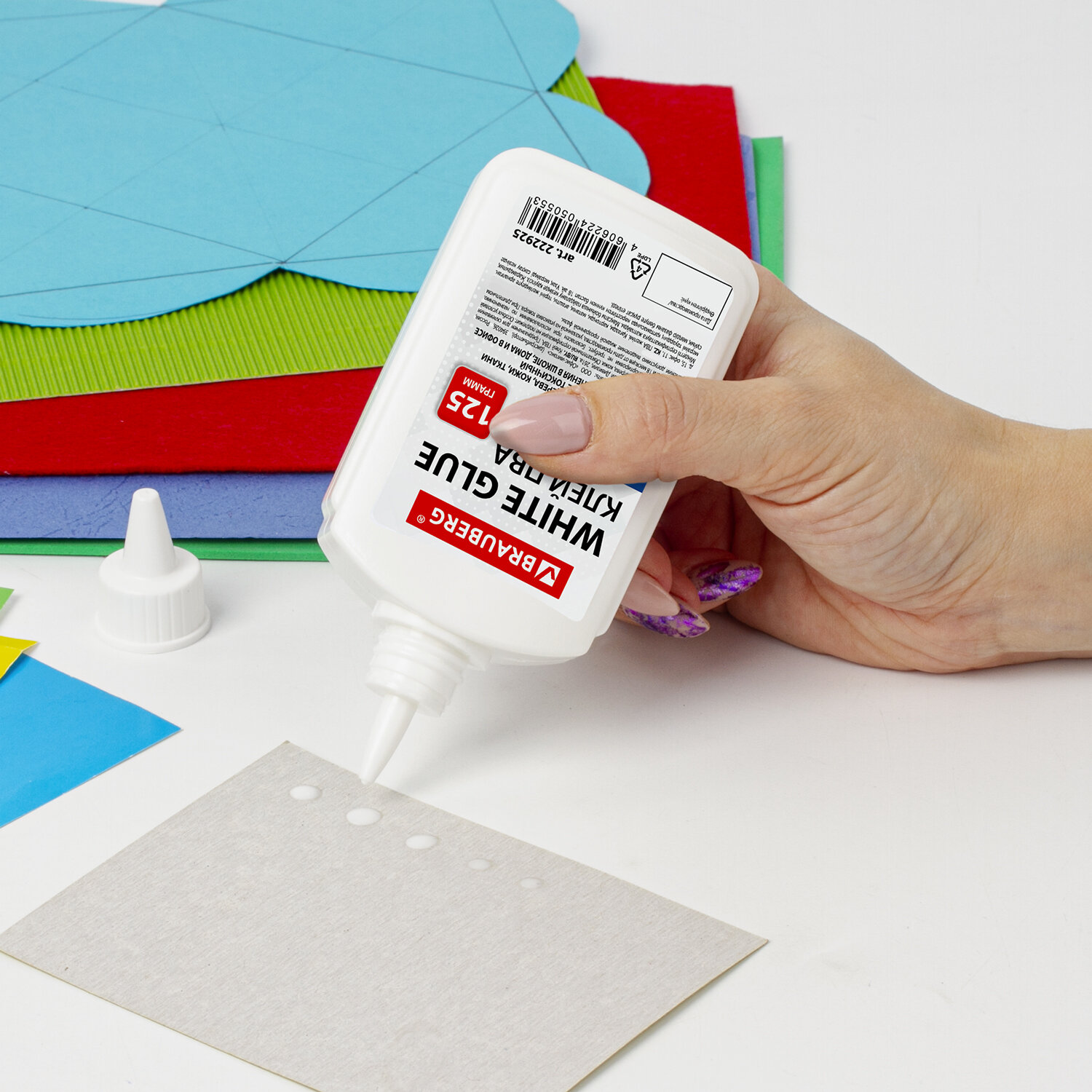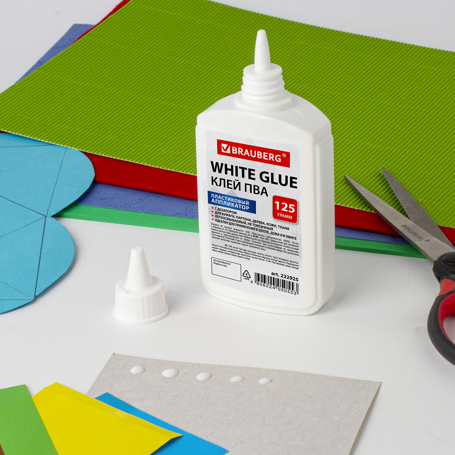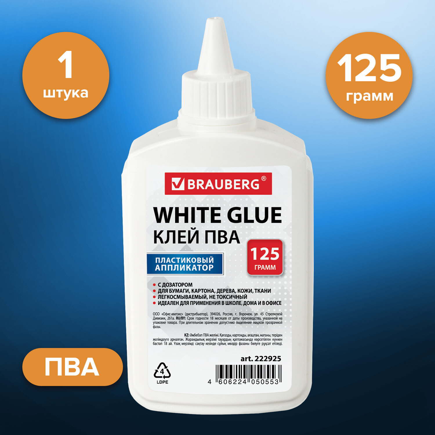 Имеет объем 125 мл. Пластиковый дозатор обеспечивает точное и равномерное нанесение. Обладает устойчивостью к морозу, не токсичен. Наносится тонким слоем, обеспечивая быстрое схватывание поверхностей, а также экономичное расходование. Съемный колпачок предохраняет клей от засыхания. Необходимо взболтать перед применением. Клей ПВА BRAUBERG (бумага, картон, дерево), 125 г, 222925