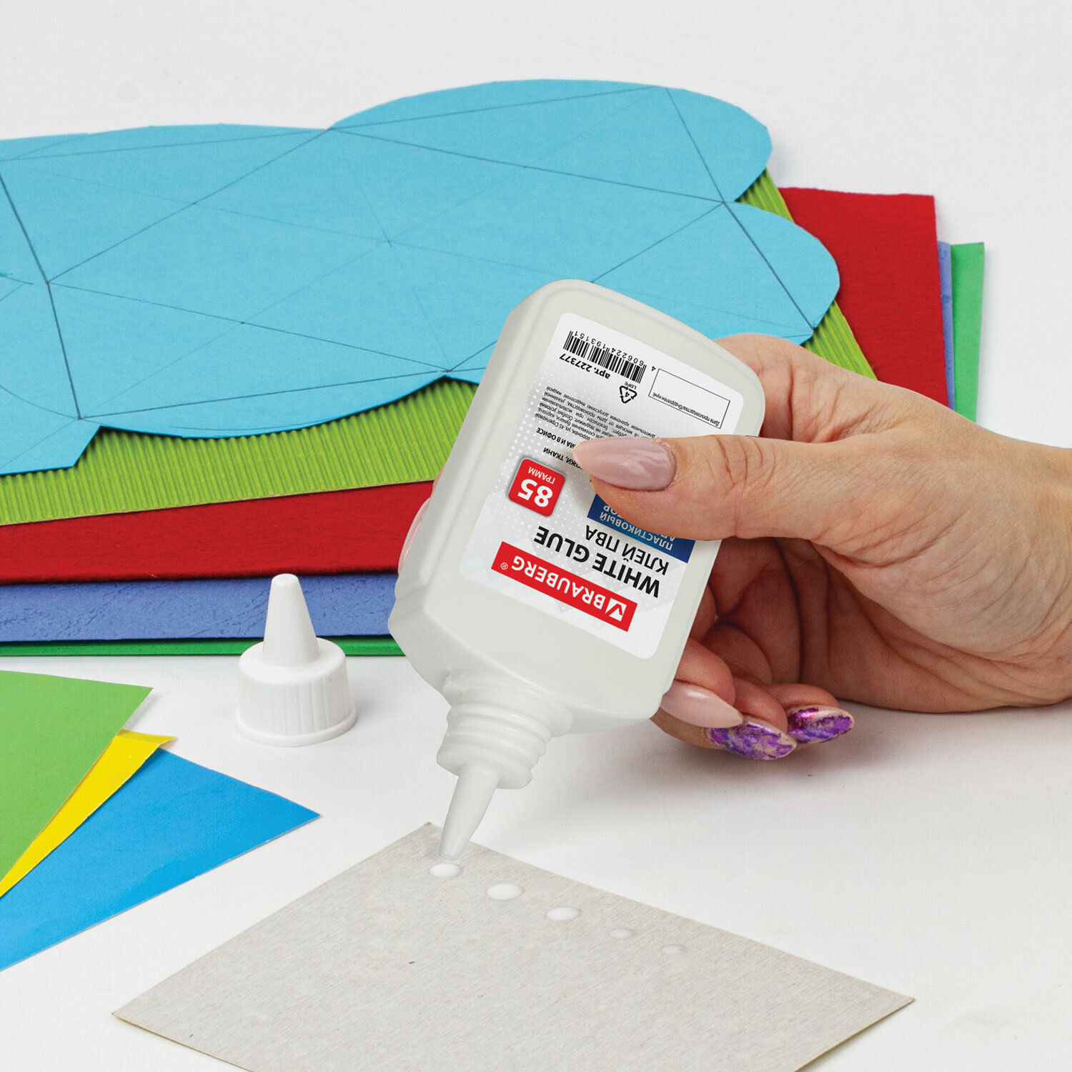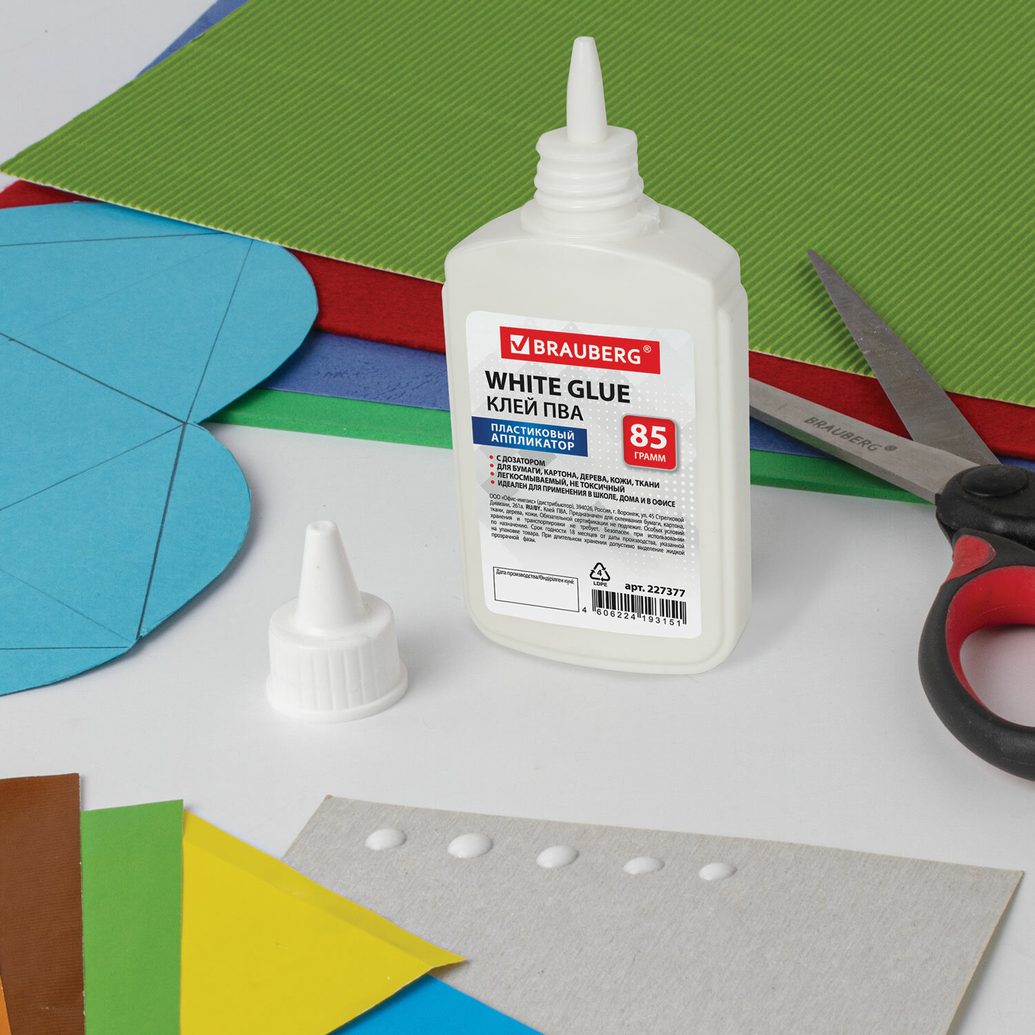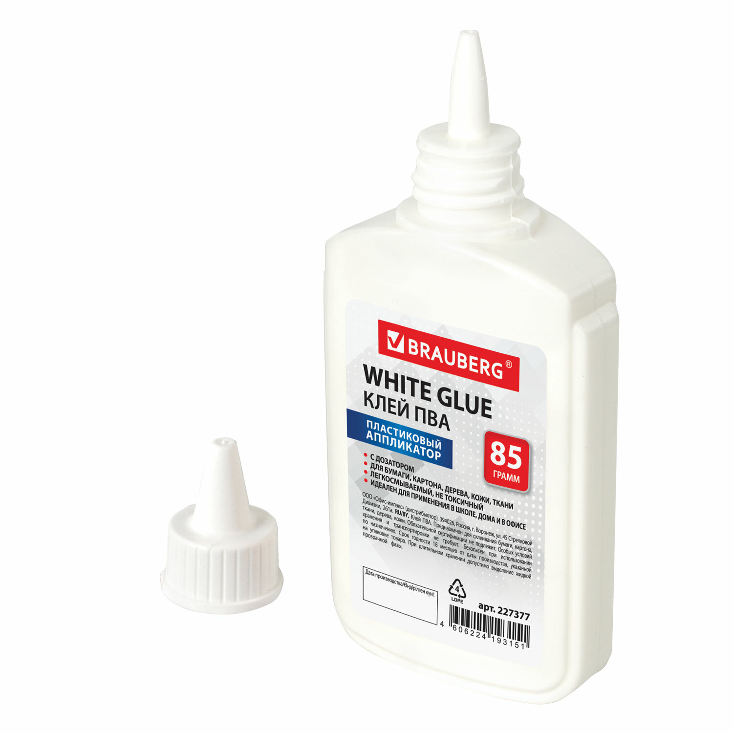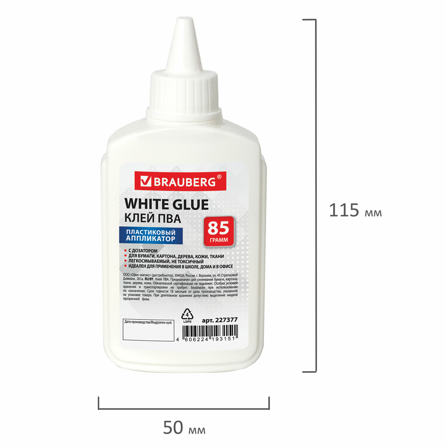 Имеет объем 85 мл. Пластиковый дозатор обеспечивает точное и равномерное нанесение. Обладает устойчивостью к морозу, не токсичен. Наносится тонким слоем, обеспечивая быстрое схватывание поверхностей, а также экономичное расходование. Съемный колпачок предохраняет клей от засыхания. Необходимо взболтать перед применением. Клей ПВА BRAUBERG (бумага, картон, дерево), 85 г, 227377