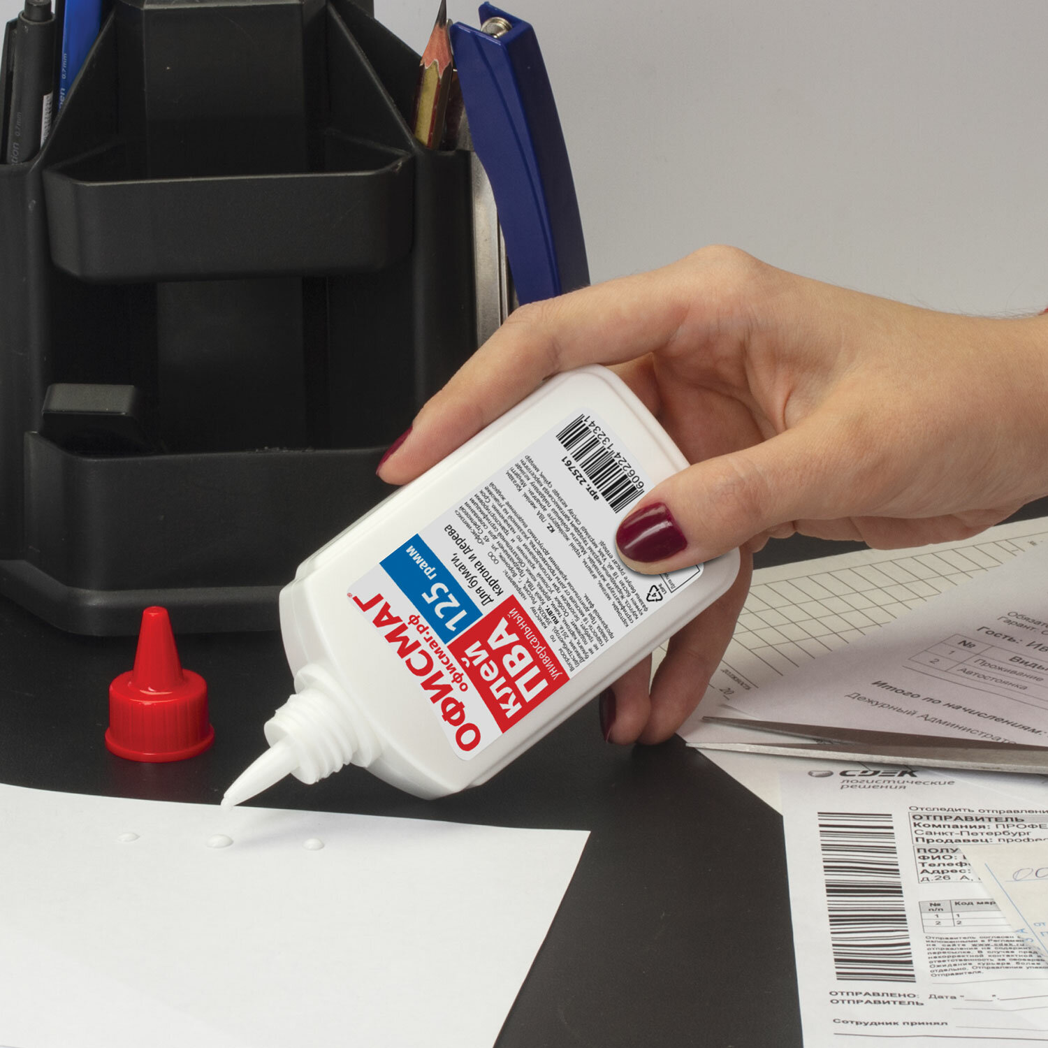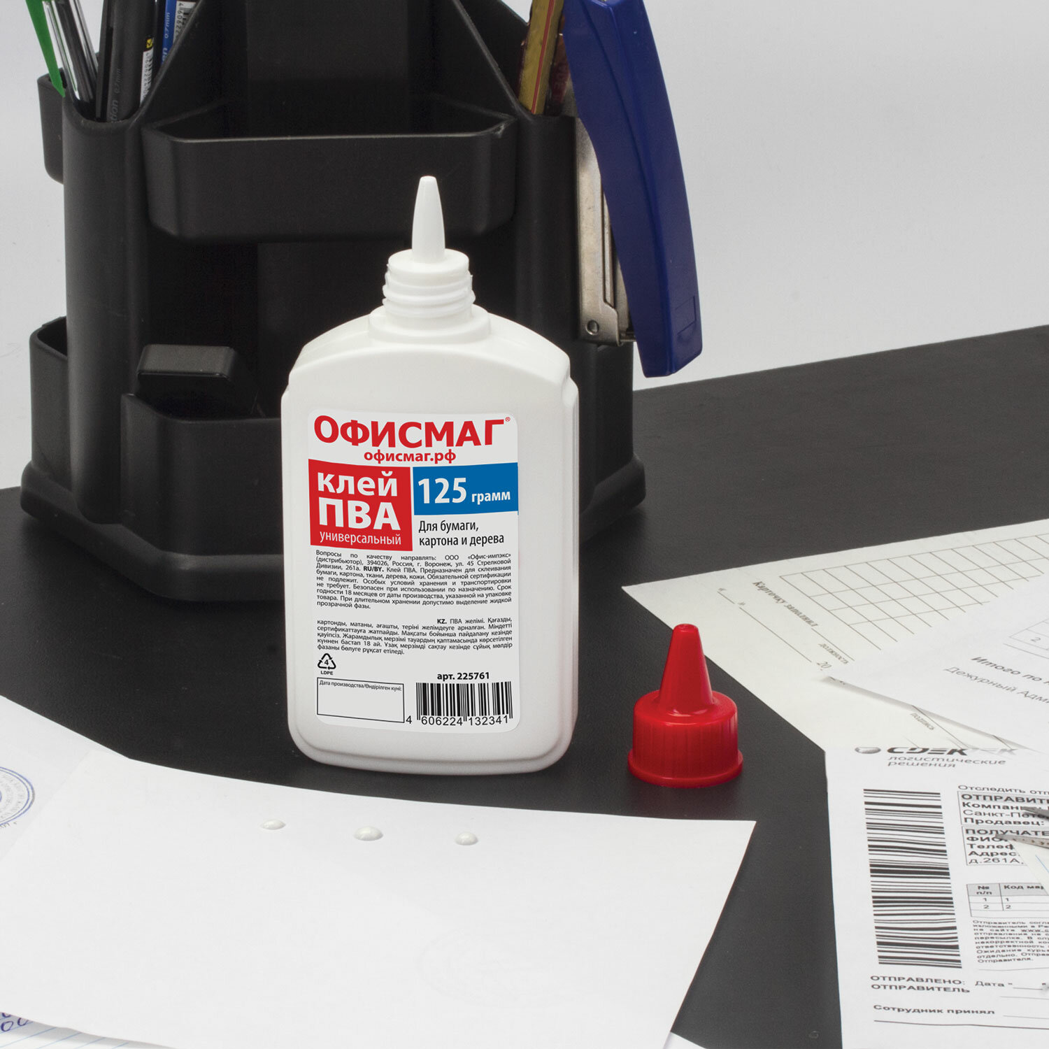 - Клей ПВА ОФИСМАГ (бумага, картон, дерево), 125 г, РОССИЯ, 225761