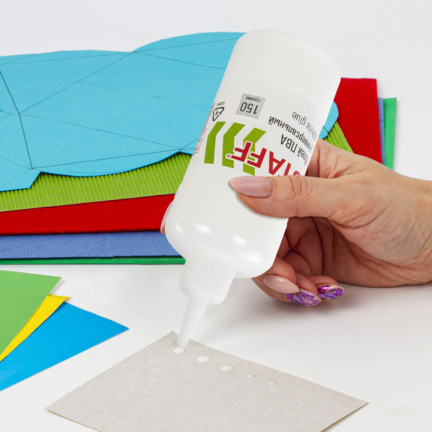 Имеет увеличенный объем 150 мл. Флакон оснащен пластиковым дозатором, который позволяет равномерно и точно наносить клей на поверхность. Нетоксичен, морозоустойчивый. Быстрое склеивание достигается за счет нанесения тонкого слоя клея. Экономичное расходование. Съемный колпачок предохраняет клей от засыхания. Необходимо взболтать перед применением. Клей ПВА STAFF евро, 150 г, 221207