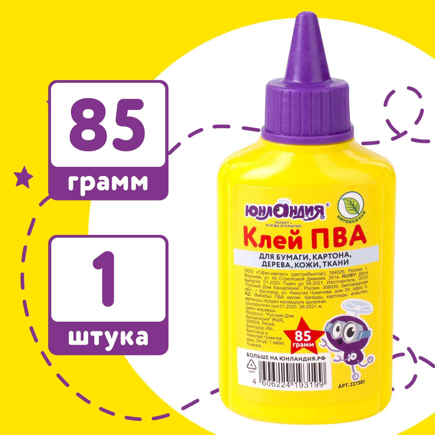- Клей ПВА ЮНЛАНДИЯ (бумага, картон, дерево), 85 г, 227381
