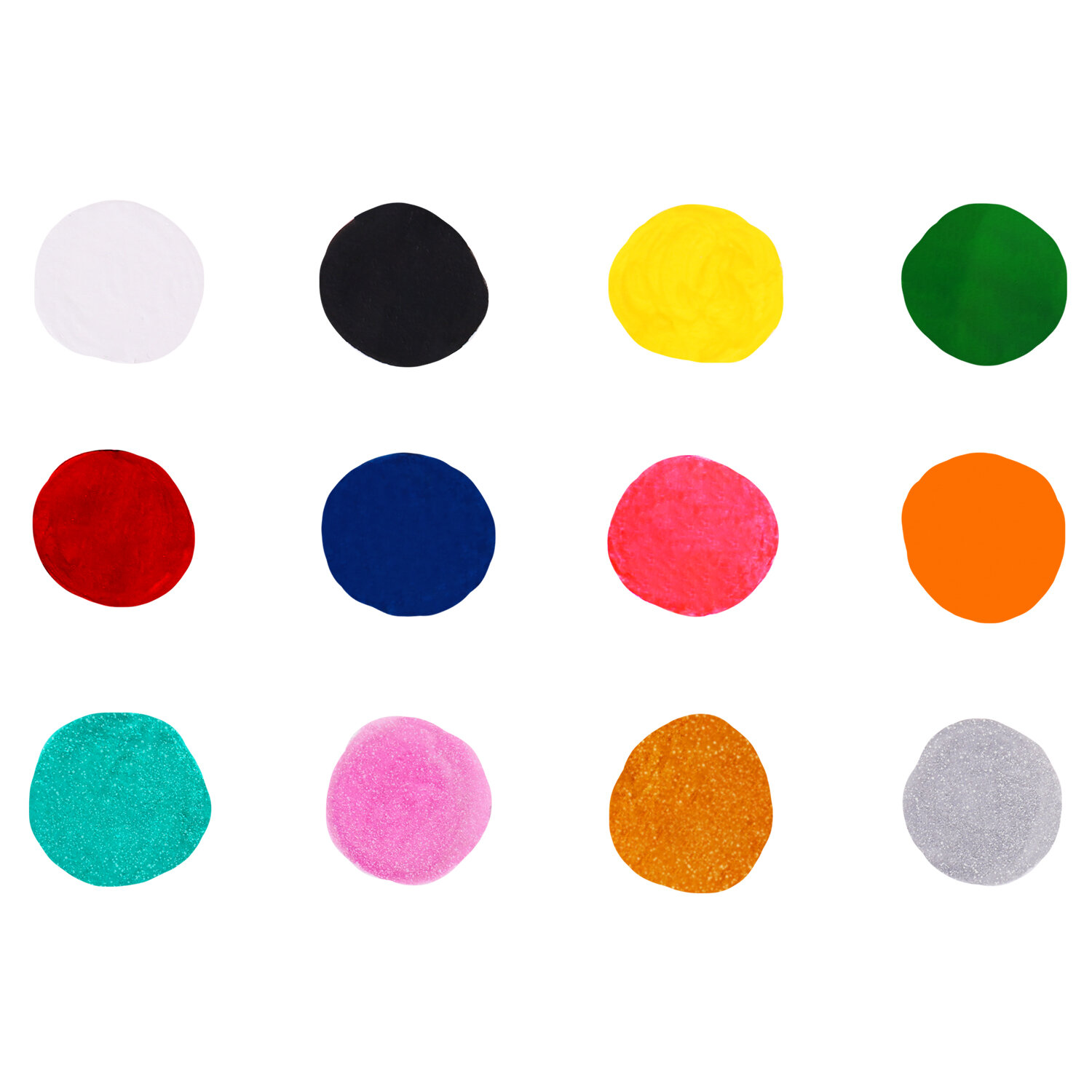 В набор входят 12 ярких цветов (6 базовых цветов; 2 цвета с эффектом металлик; 2 цвета с эффектом перламутр; 2 неоновых цвета): белый, черный, желтый, красный, синий, зеленый; золото, серебро; бирюзовый перламутровый, малиновый перламутровый; оранжевый неоновый, розовый неоновый.