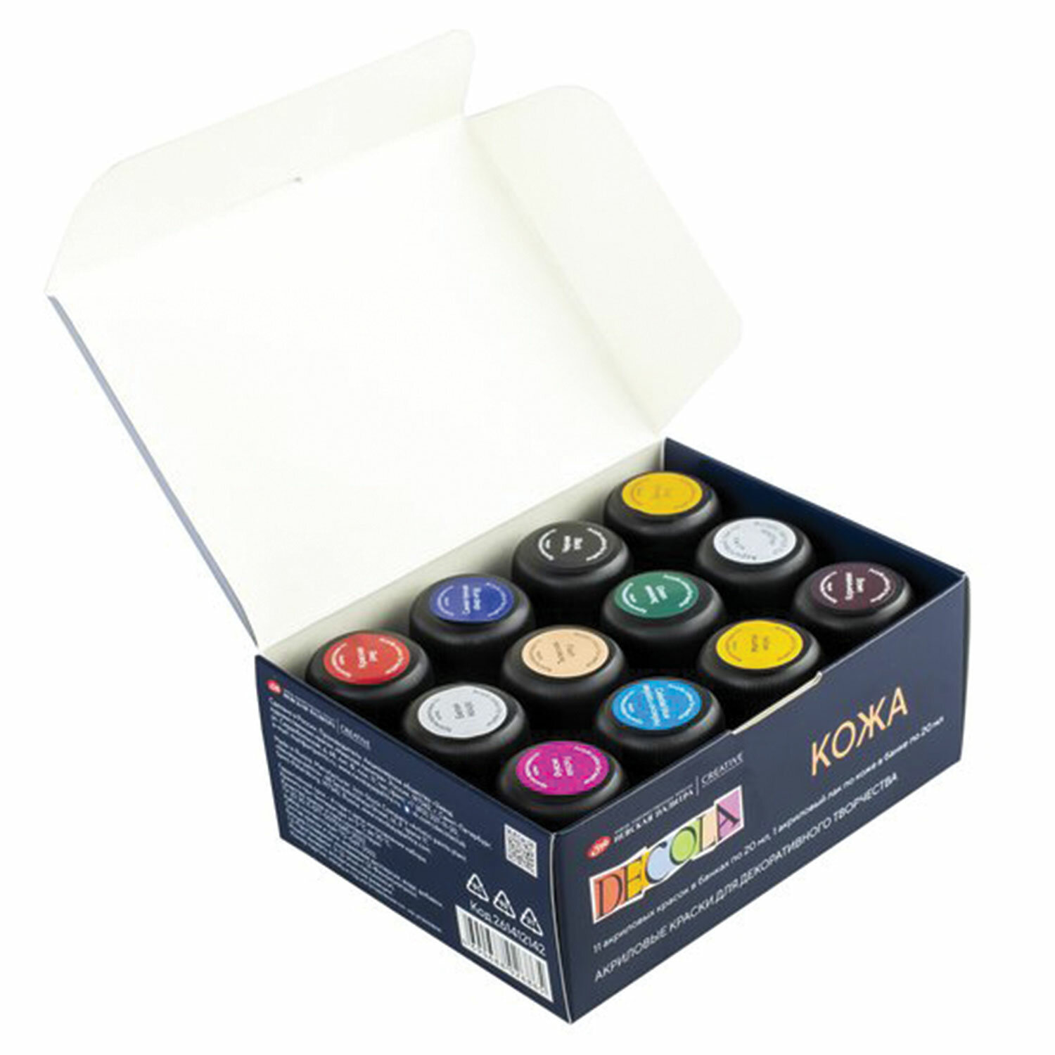 - Краски акриловые по коже "Декола", 11 цветов + акриловый лак по 20 мл, в банках, Невская Палитра, 261412142