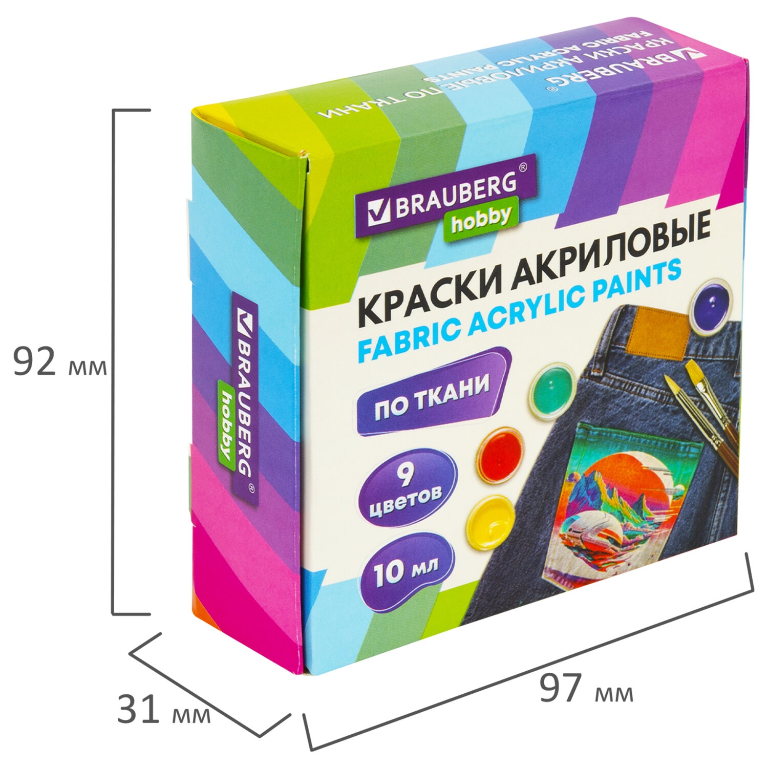 Краски акриловые по ткани 9 цветов по 10 мл, BRAUBERG HOBBY, 192442