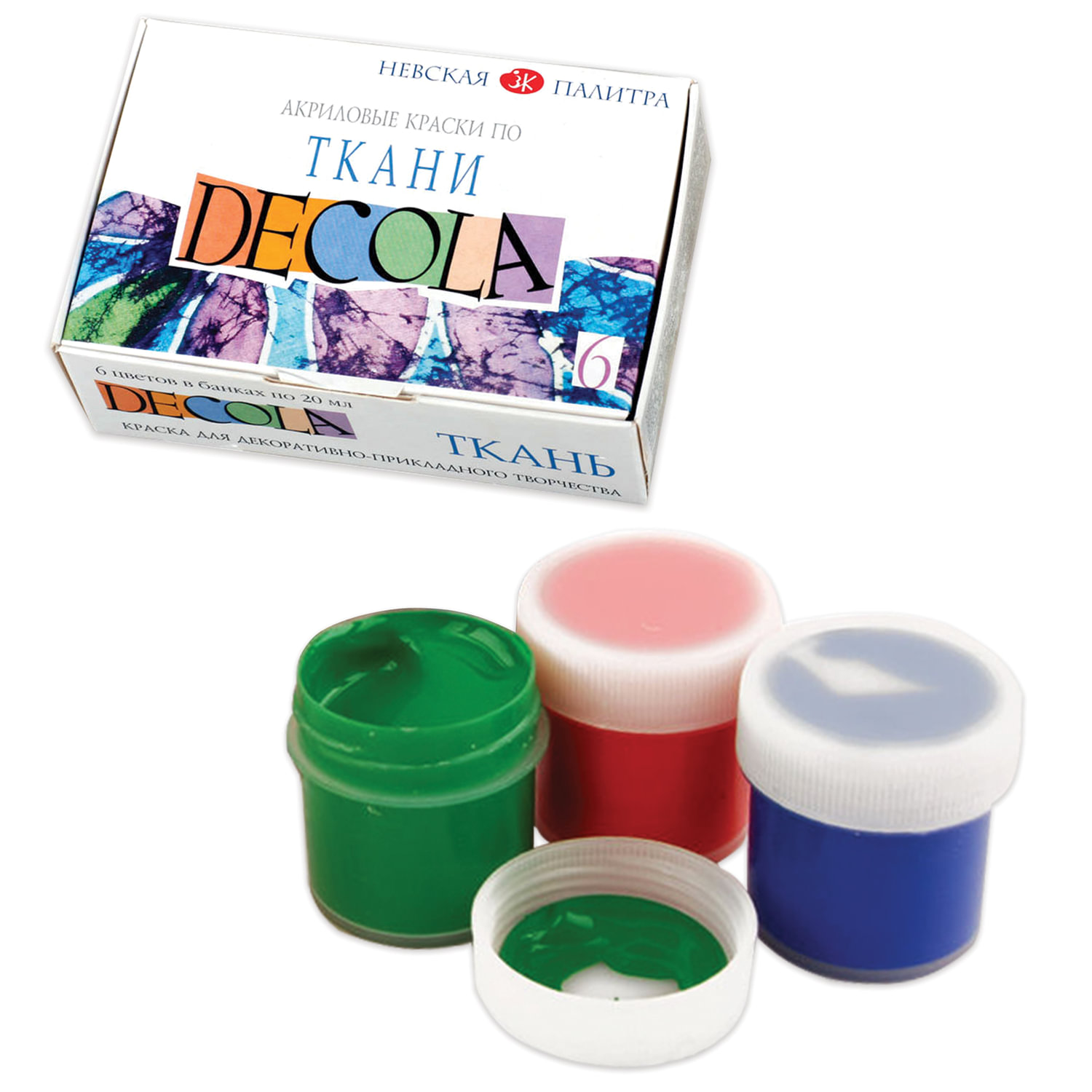 Краски высокого качества. Обладают превосходными покрывными свойствами. Краски по ткани акриловые "Декола", 6 цветов по 20 мл, в баночках, Невская Палитра, 4141025
