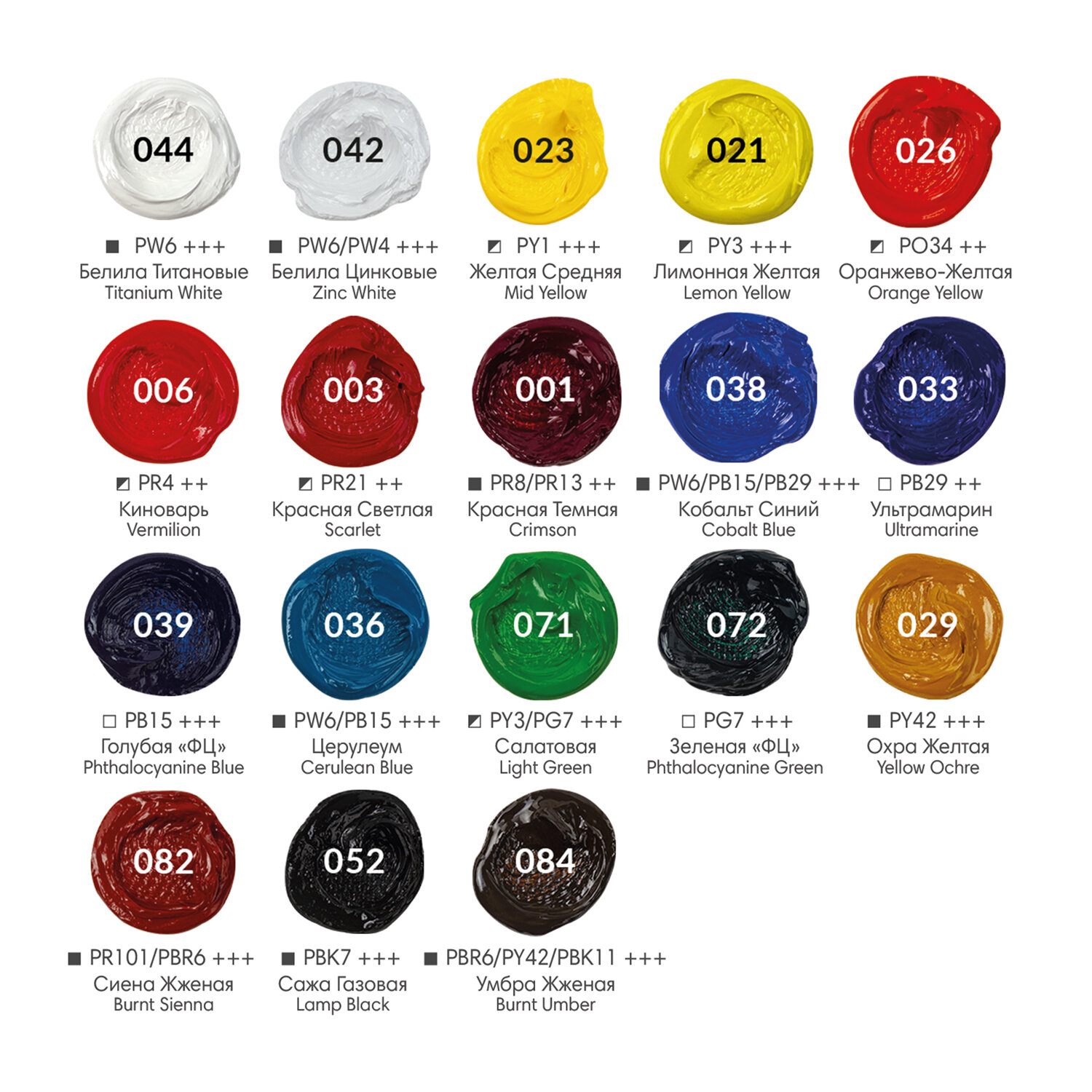 Краска имеет 5 степеней затирки пигмента. Вязкая текстура краски обеспечивает сохранение ее эластичности в течение длительного времени. Все краски легко смешиваются между собой. Объем тубы - 12 мл.