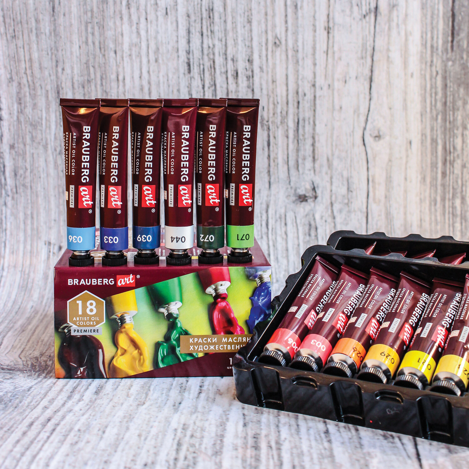 - Краски масляные художественные BRAUBERG ART PREMIERE, 18 цв. по 22 мл, в тубах, 191459