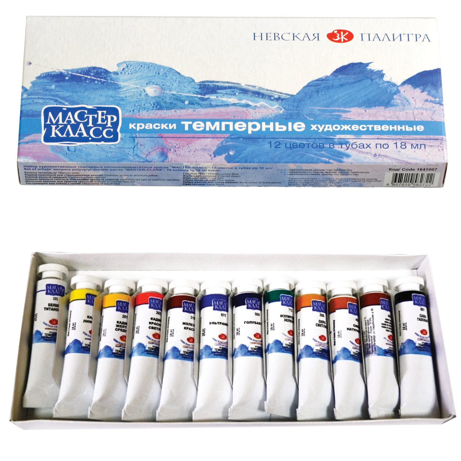Состав набора: белила титановые, охра светлая, кадмий желтый средний, кадмий красный светлый или кадмий красный темный, железная красная или краплак красный, ультрамарин или кобальт синий, голубая «ФЦ» или церулеум, кадмий лимонный или кадмий желтый светлый, изумрудно-зеленая или окись хрома, сиена натуральная, сажа газовая, умбра жженая или сиена жженая. Краски темперные художественные "Мастер-класс", НАБОР 12 цветов по 18 мл, в тубах, без кисти, Невская Палитра, 16412095