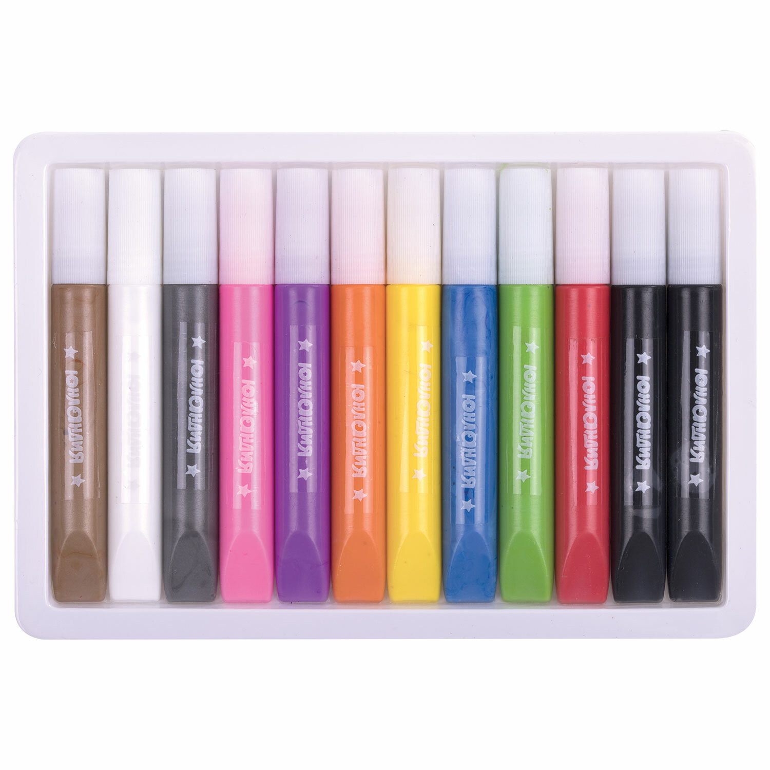 В набор витражных красок входят 12 ярких непрозрачных красок в 11 цветах (красный, синий, зеленый, желтый, черный, оранжевый, фиолетовый, розовый, белый, золотой, серебристый) в тубах по 10,5 мл, книга с шаблонами для рисования и пленка для предварительного создания аппликаций из красок. В наборе 2 тубы с краской черного цвета для создания черного контура. Готовые самоклеящиеся аппликации можно многократно переносить на любые гладкие поверхности.