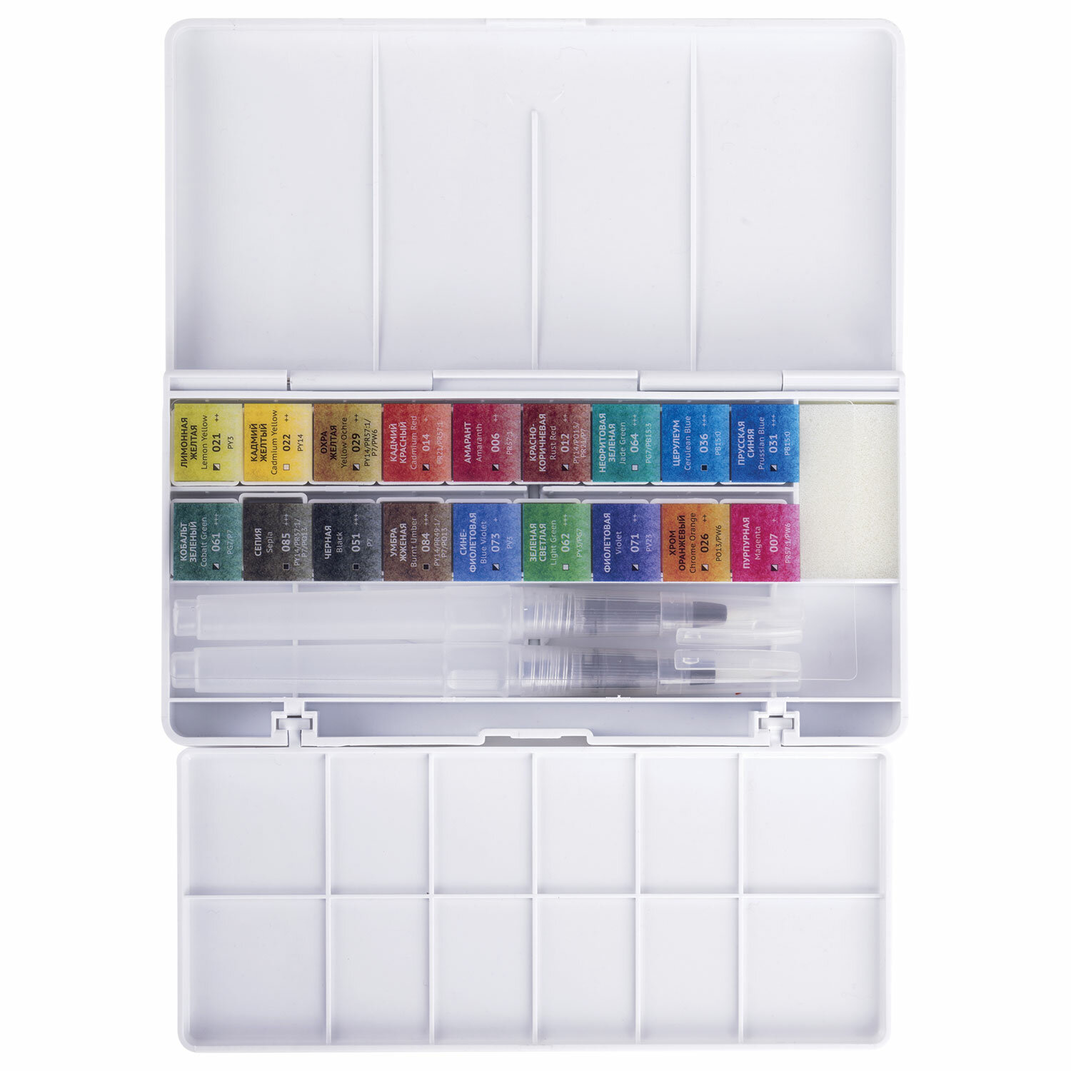 Акварель в кюветах поставляется в пластиковом пенале с палитрой, две кисти с резервуаром в комплекте.