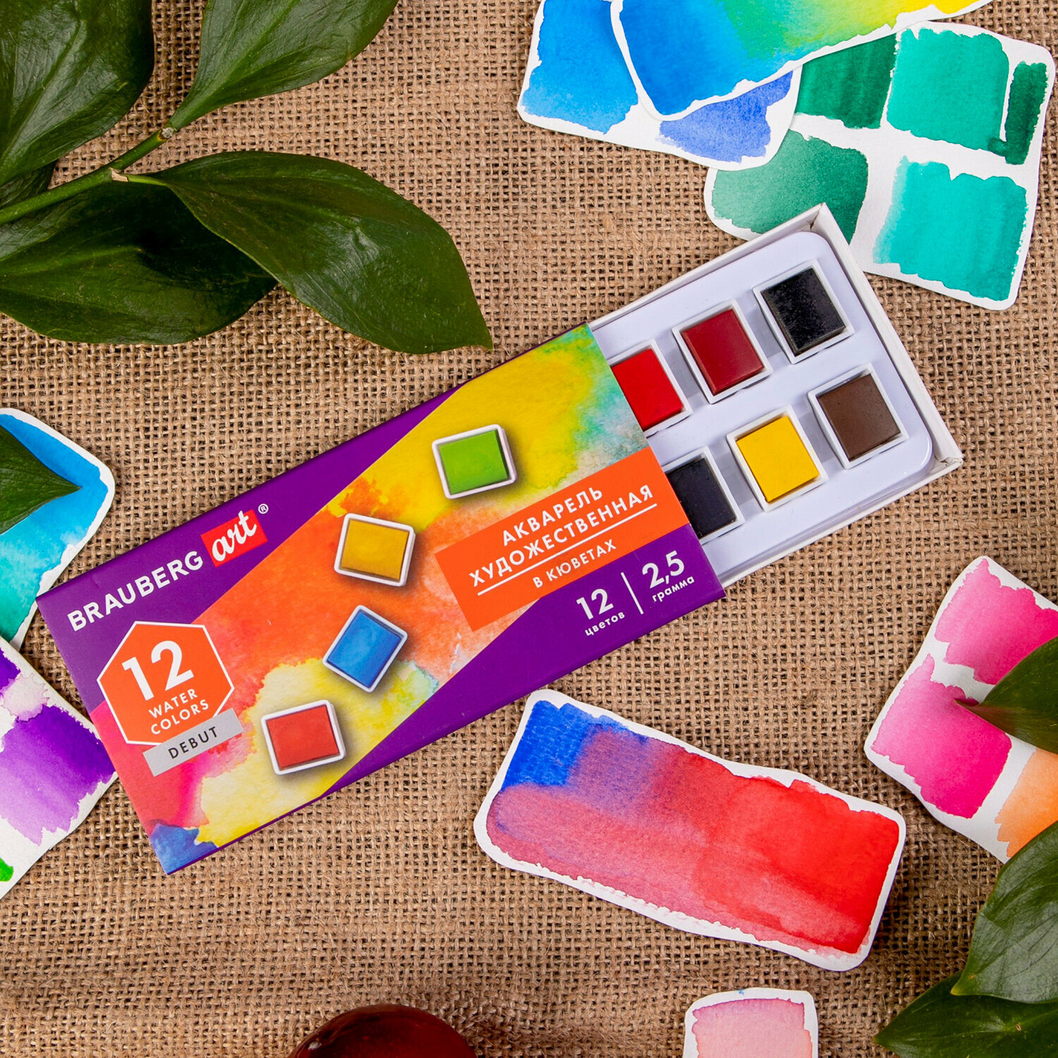 - Акварель художественная в кюветах НАБОР 12 цветов по 2,5 г, BRAUBERG ART DEBUT, 191776