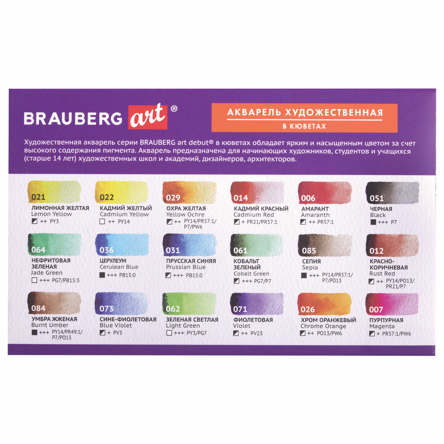 - Акварель художественная в кюветах НАБОР 18 цветов по 2,5 г, BRAUBERG ART DEBUT, 191777