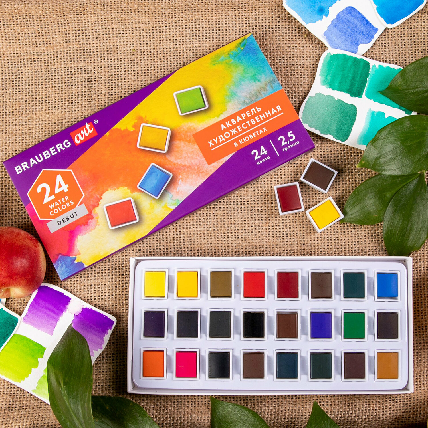 В наборе 24 цвета в кюветах по 2,5 грамма: