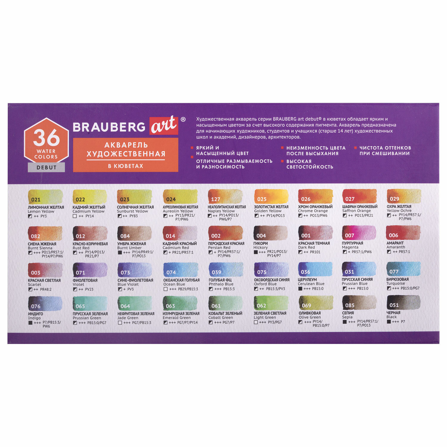 - Акварель художественная в кюветах НАБОР 36 цветов по 2,5 г, BRAUBERG ART DEBUT, 191779